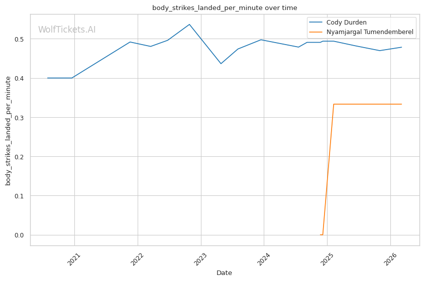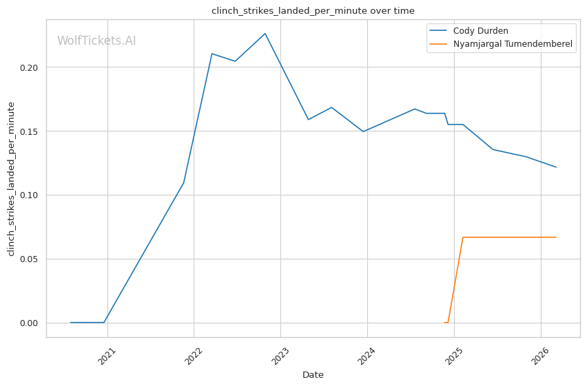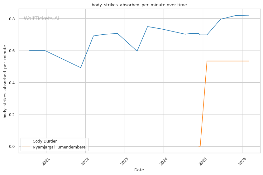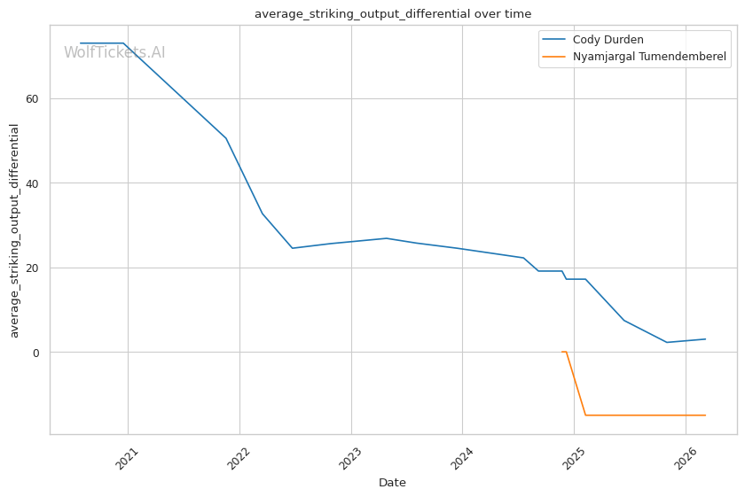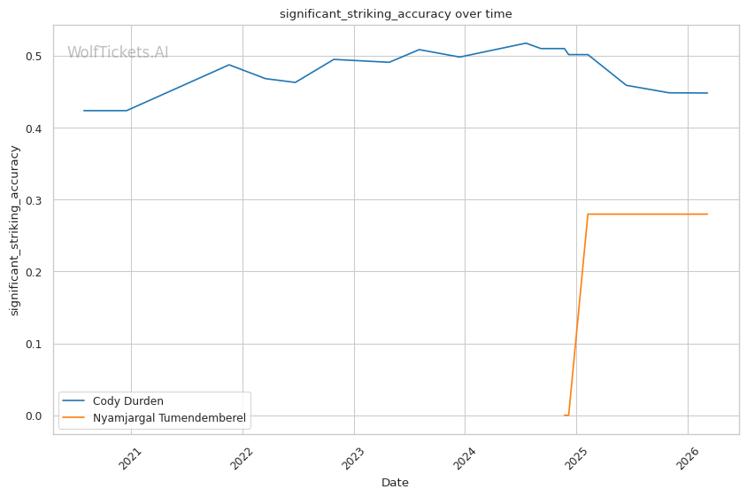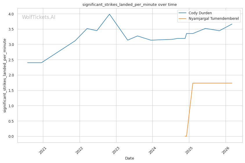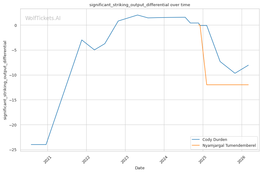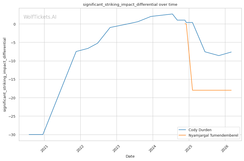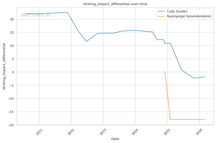 Significant Striking Impact Differential (+1.0) and Recent Significant Striking Impact Differential (+1.0): Despite negative differentials for both, Durden's numbers are less concerning than Tumendemberel's.
