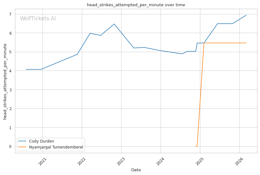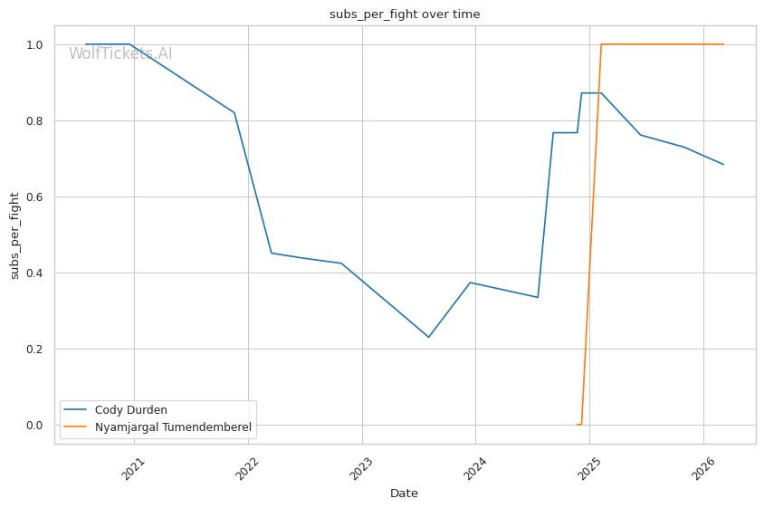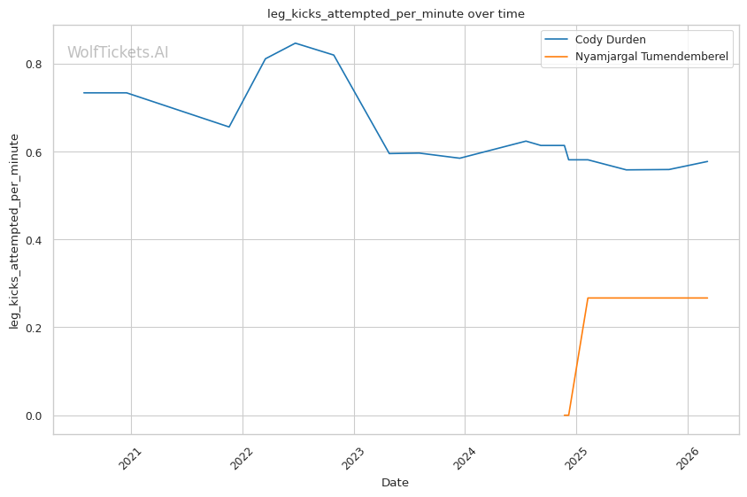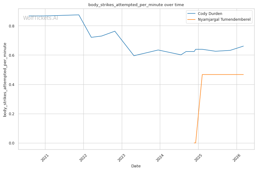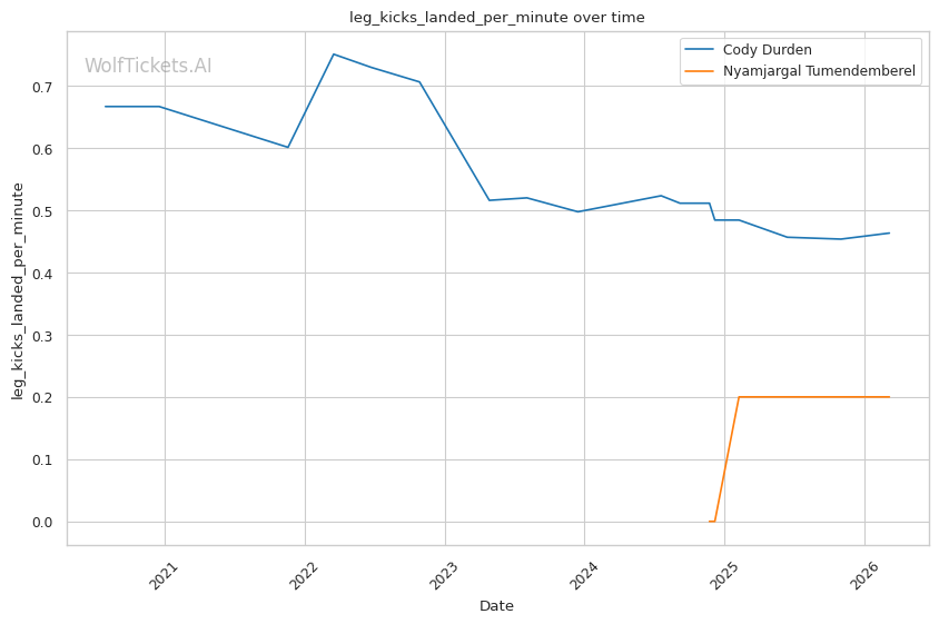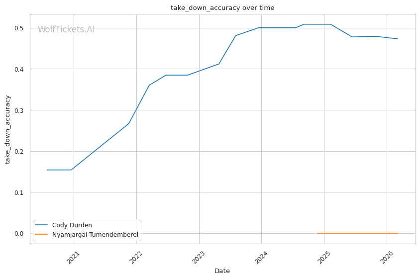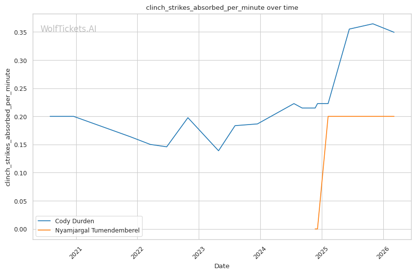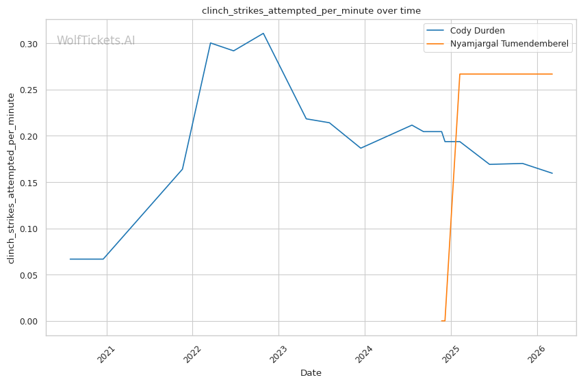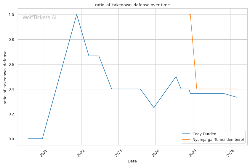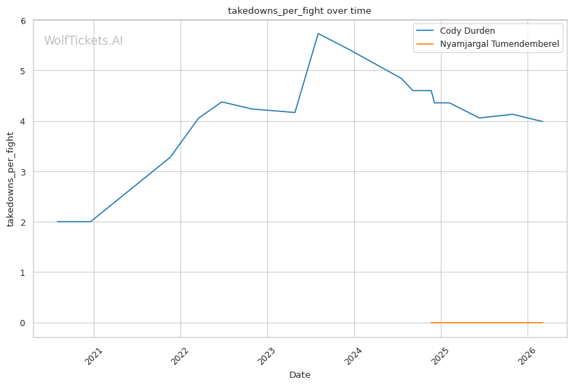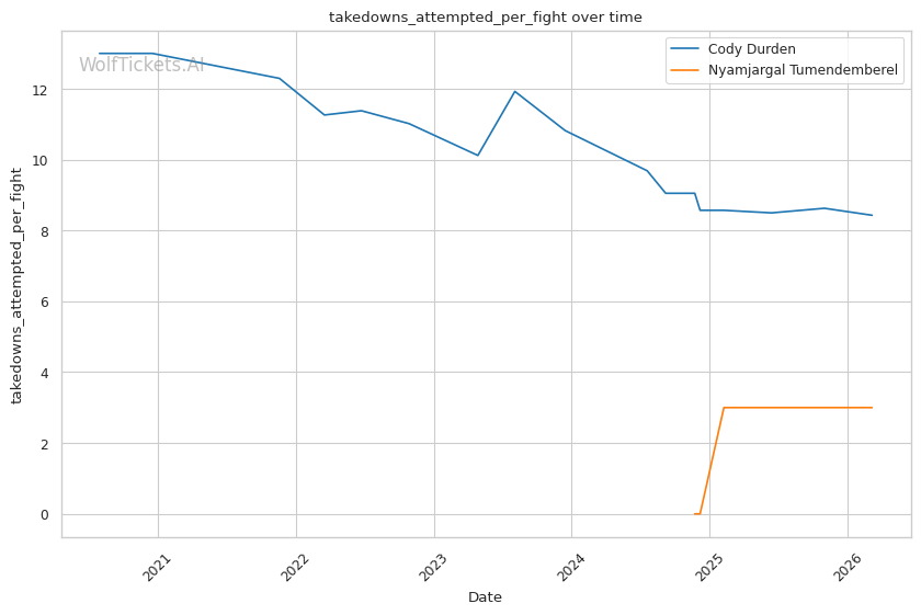 Durden's wrestling volume should overwhelm Tumendemberel's limited takedown defense. Durden attempts nearly 8 takedowns per fight and lands almost 4. Tumendemberel's 40% TDD will be tested repeatedly.