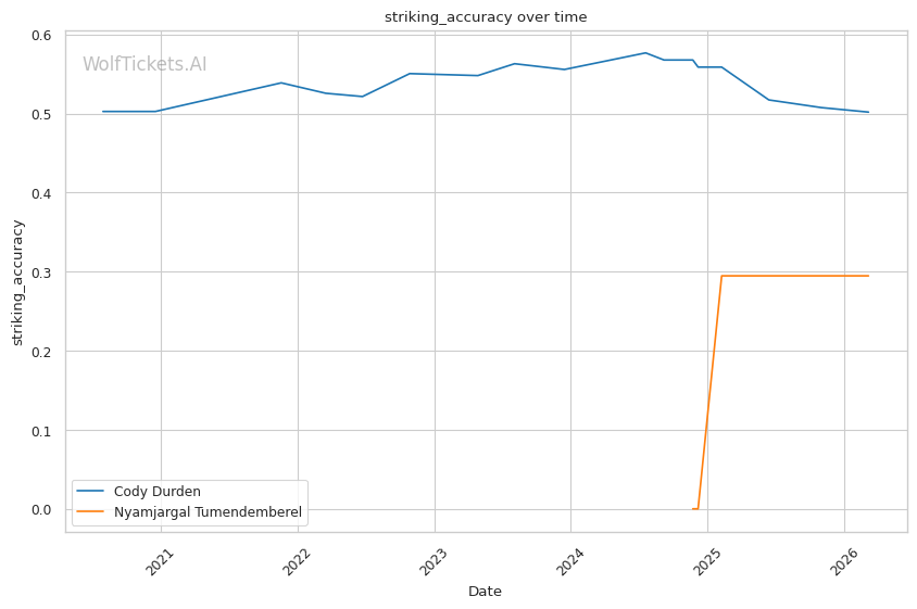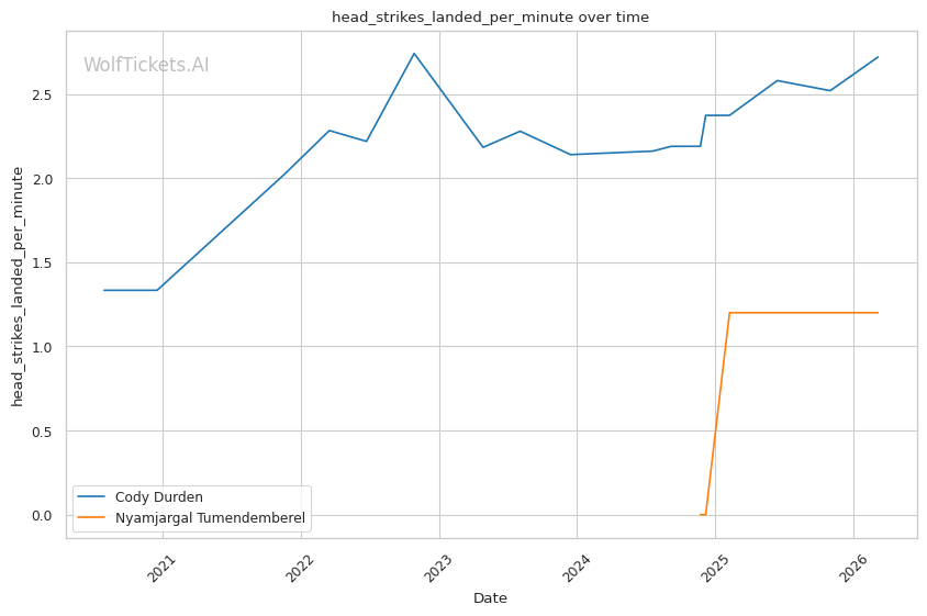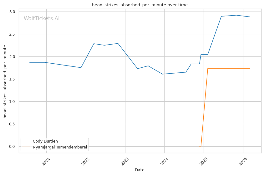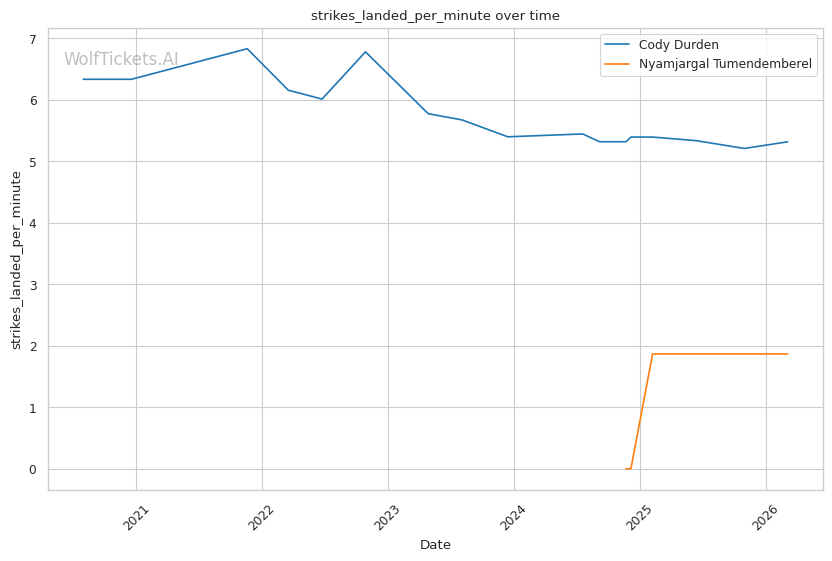 Tumendemberel's striking output is concerning. Landing 1.73 significant strikes per minute with 28% accuracy against Hernandez does not inspire confidence against Durden's forward pressure.