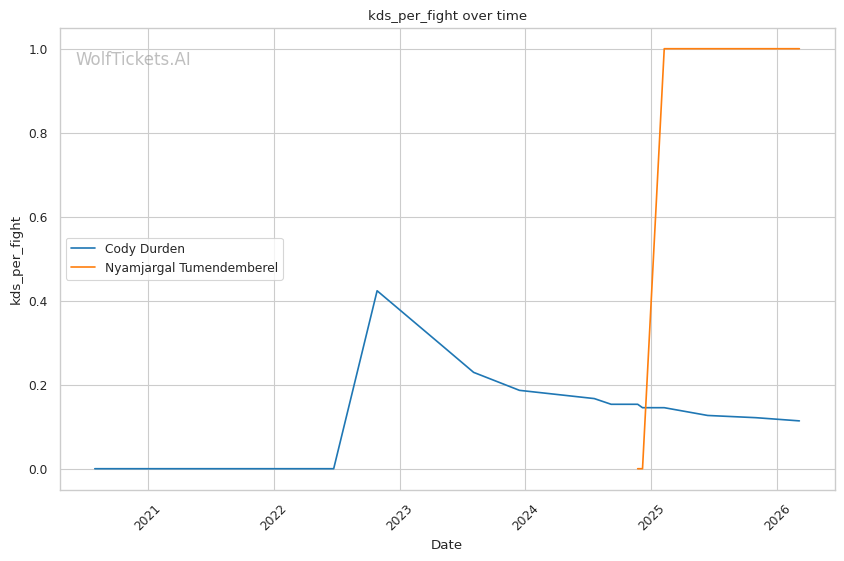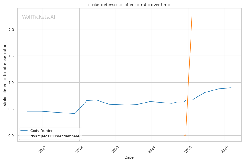 Recent Takedowns Attempted per Fight (+4.0): This is the biggest factor. Durden's wrestling volume (7.8 recent attempts per fight) dwarfs Tumendemberel's limited grappling output.