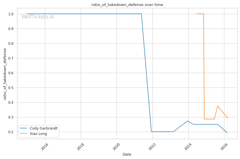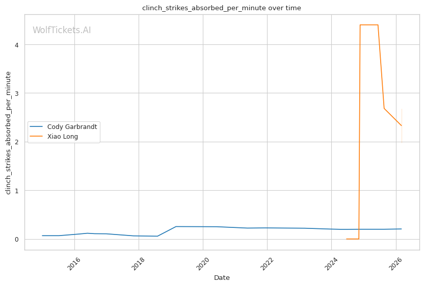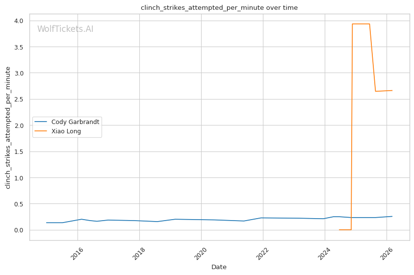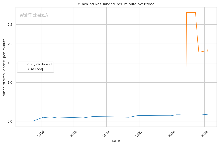 Long's striking output is impressive. He lands 7.43 strikes per minute with 50% accuracy, significantly higher volume than Garbrandt. He mixes his attacks well, going to the body (1.16 body strikes per minute) and working the clinch effectively (1.86 clinch strikes per minute). Against ChangHo Lee, Long controlled the clinch using his 70-inch reach to dictate distance and landed knees and elbows from that position.