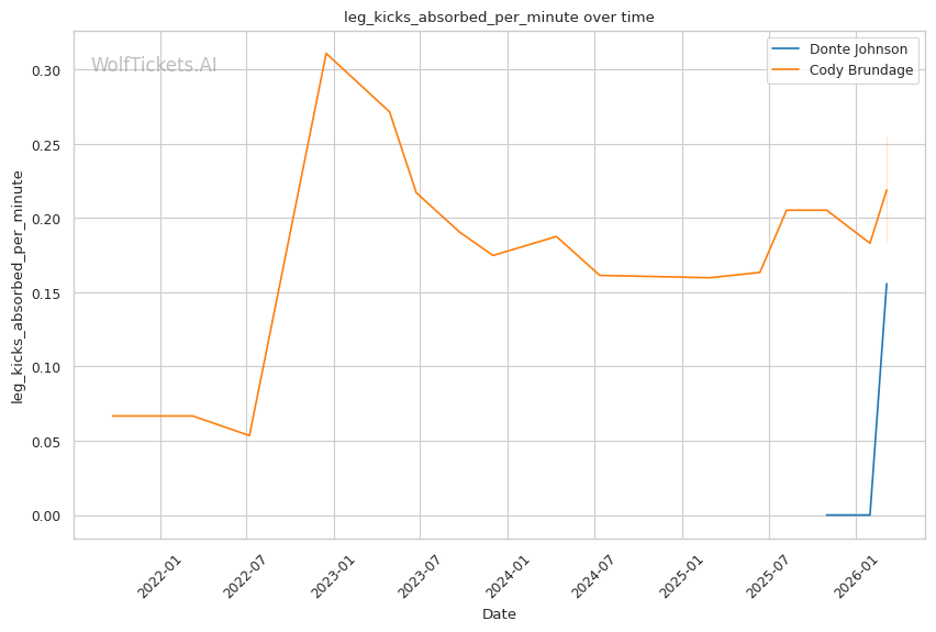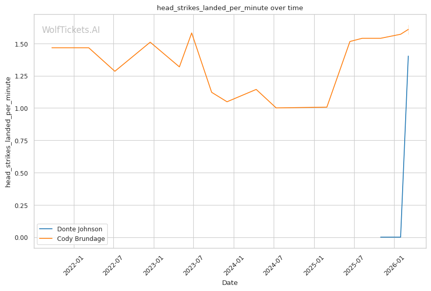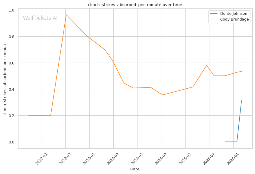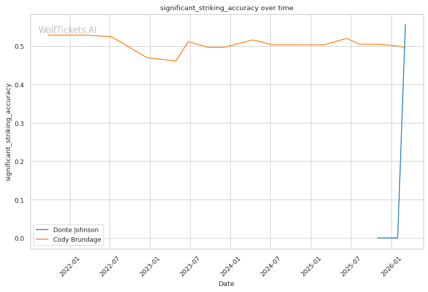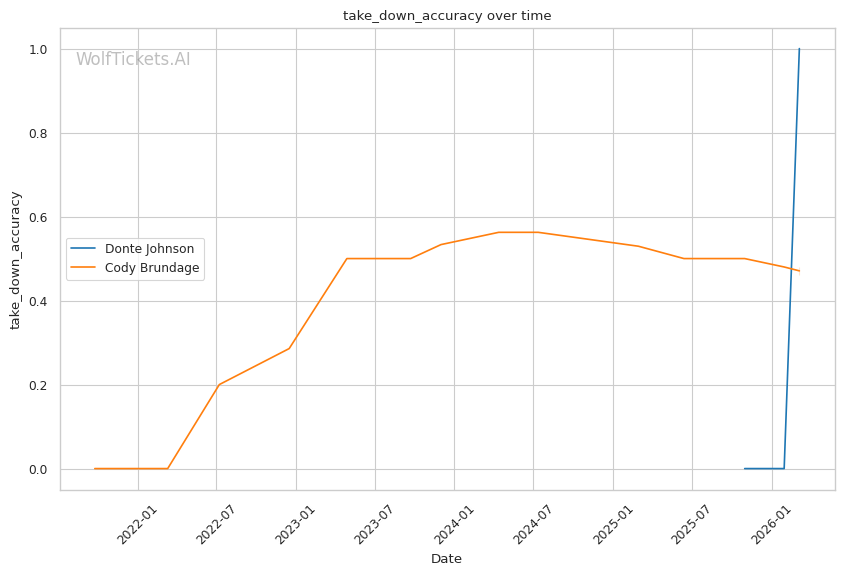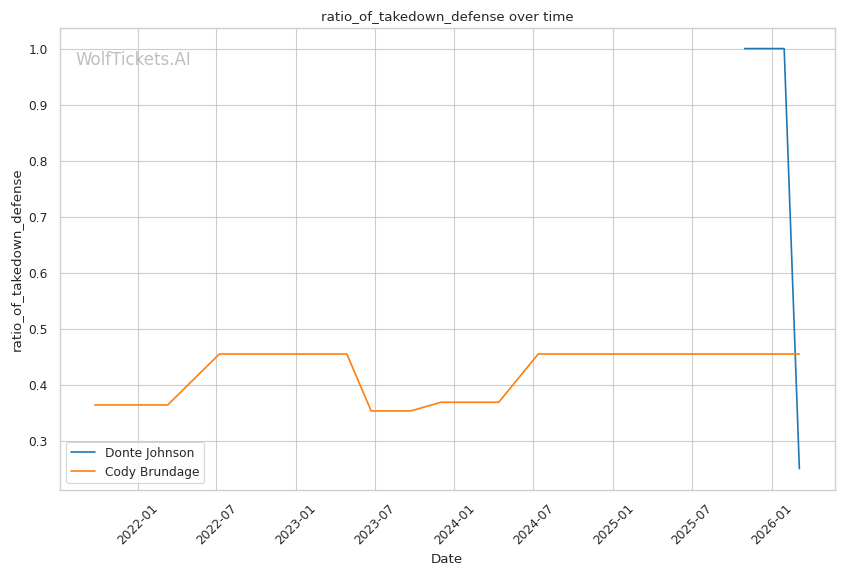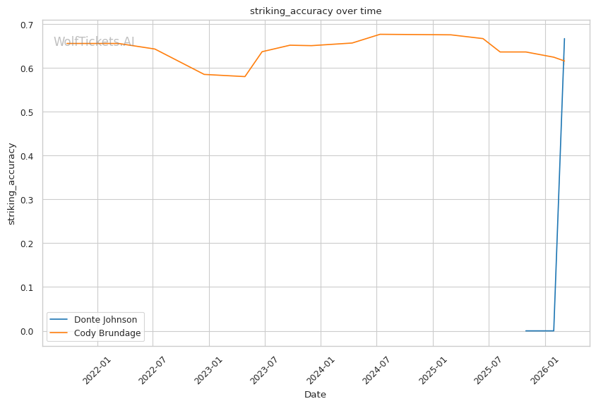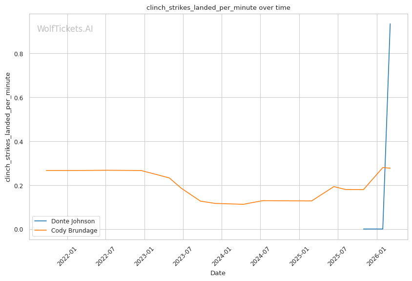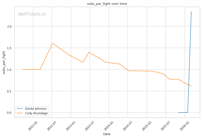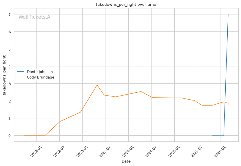 On the ground, this matchup favors Johnson. While Brundage has wrestling credentials, his 46% takedown accuracy and 45% takedown defense suggest he is not elite in either area. Johnson went 3/3 on takedowns against Dumas and showed competent top control. If Brundage shoots carelessly, Johnson has the awareness to catch a guillotine or sprawl and punish.