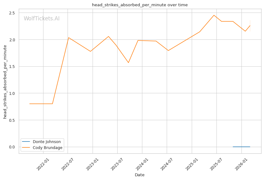 Striking Defense - Brundage is hittable. His 39.86% striking defense percentage and 50.74% significant striking defense percentage are poor. Against Lungiambula, he landed only 4 strikes while absorbing 50. Against Rowston, he left himself open while pressing forward, allowing heavy right hands to land clean.