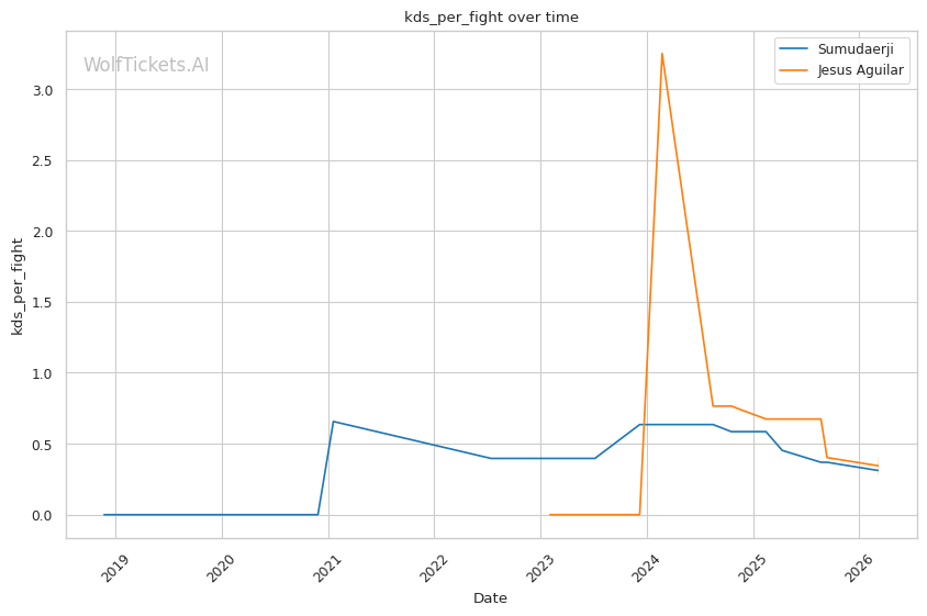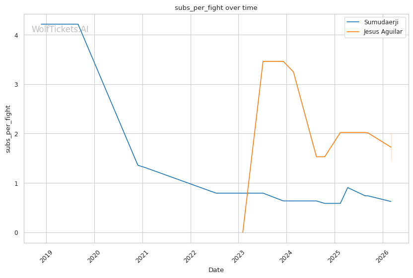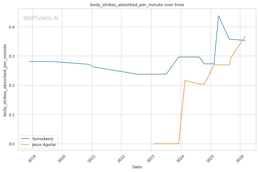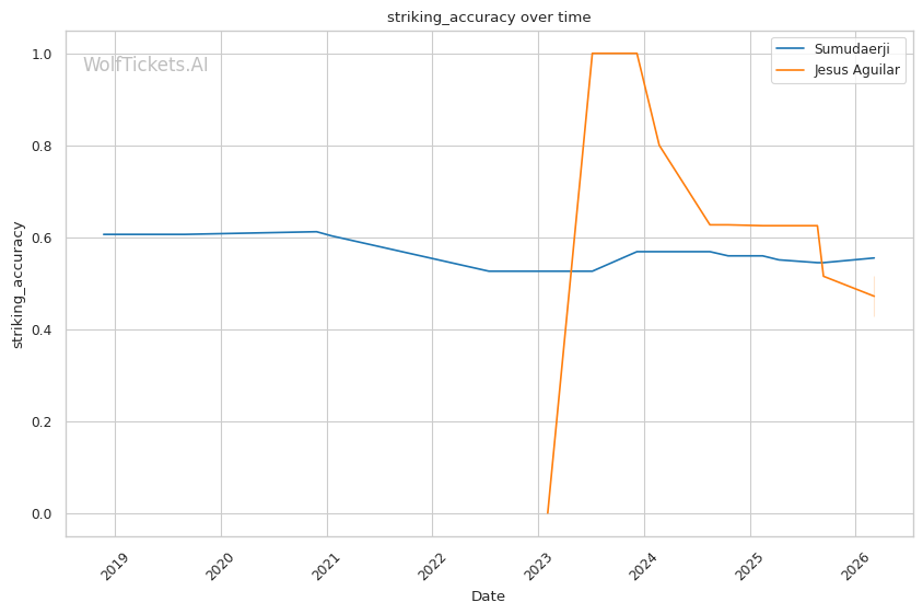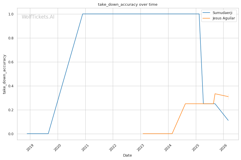 WolfTicketsAI has a solid track record with Sumudaerji. The model correctly predicted his wins over Borjas (0.64 score) and Raposo (0.70 score). It also correctly predicted his loss to Johnson. However, the model was wrong twice when picking Sumudaerji against Elliott and Schnell, both fights ending in submission losses. This is worth noting since Aguilar does have submission skills.