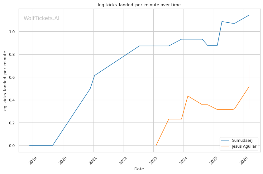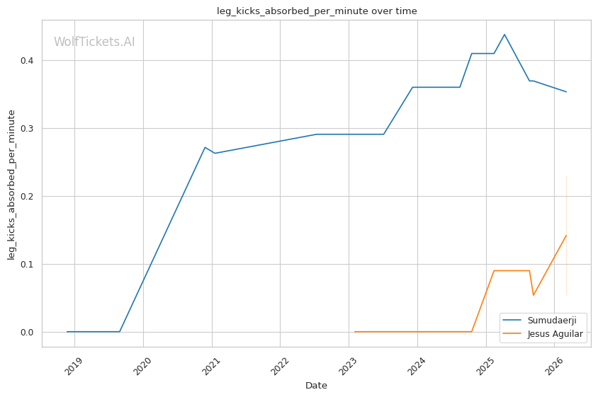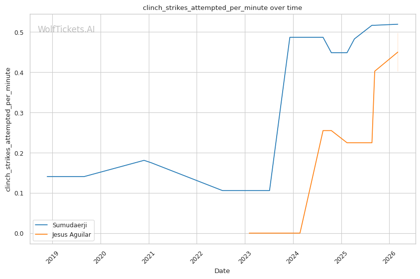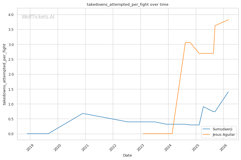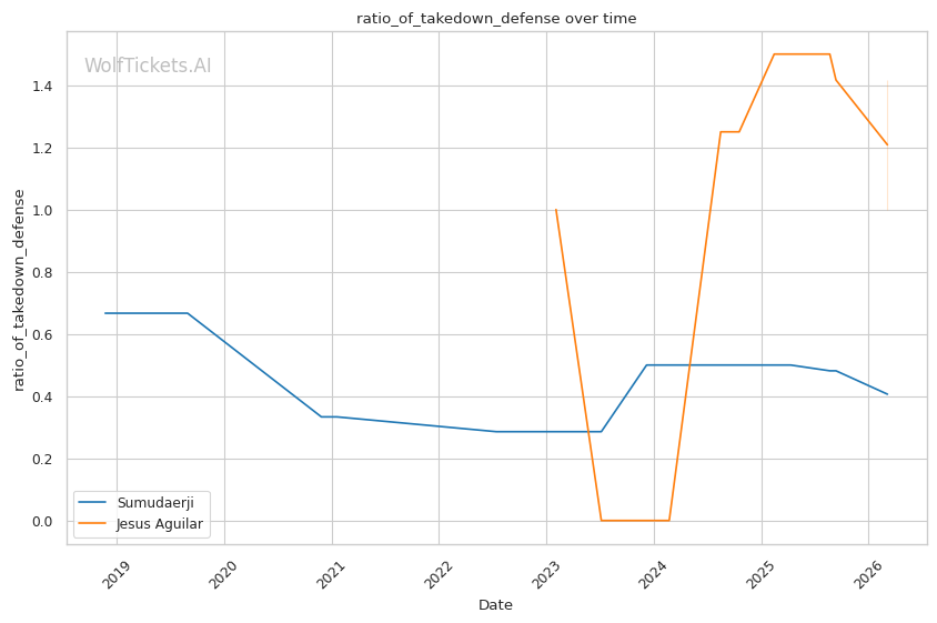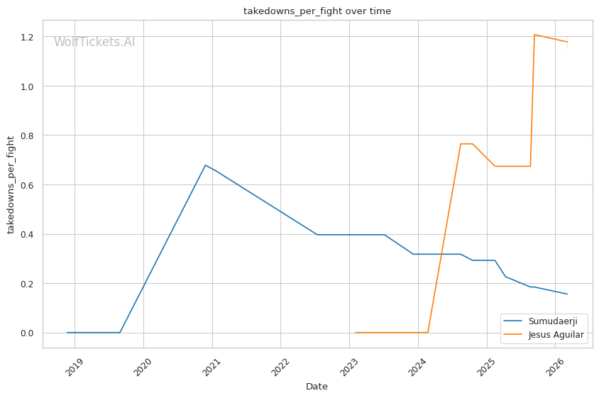 Sumudaerji's inside low kicks could disrupt Aguilar's forward pressure the same way they worked against Raposo. If Aguilar's stance gets compromised by leg kicks, his takedown entries become telegraphed.