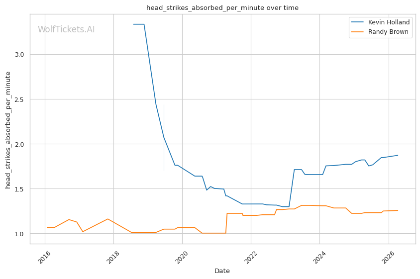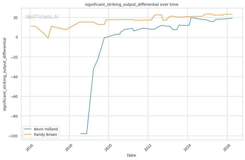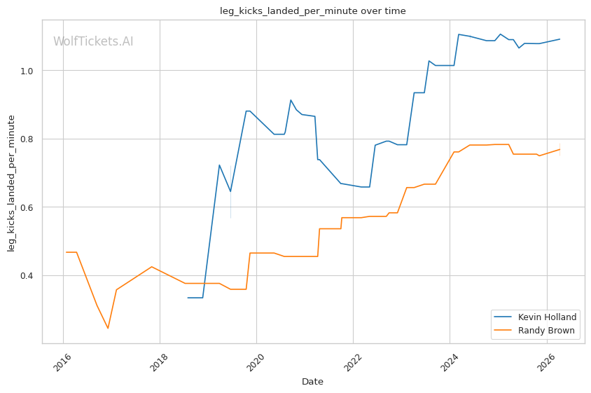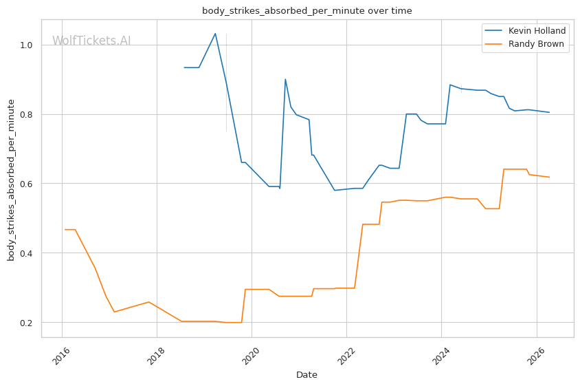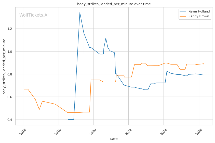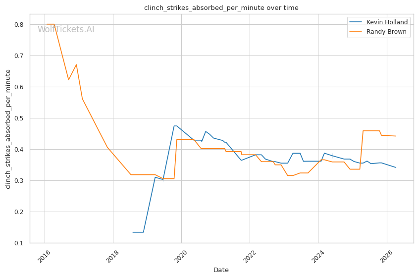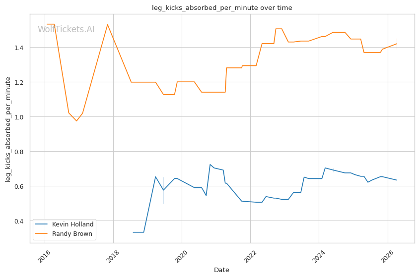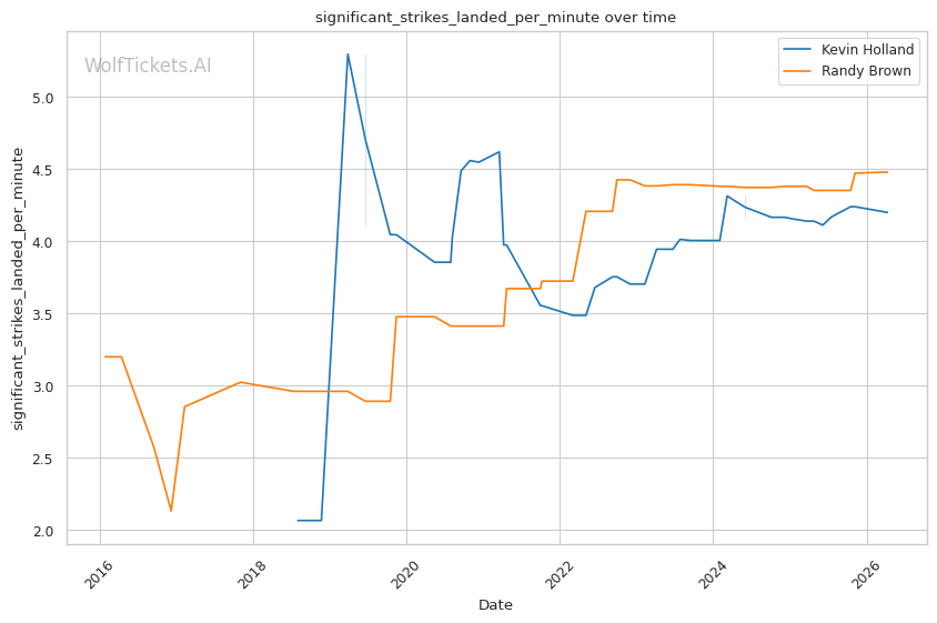 The leg kick dynamic is interesting. Brown showed vulnerability to calf kicks against Bonfim, but Holland is not known as a leg kicker. Holland absorbs 0.63 leg kicks per minute while landing 1.09 per minute. If Holland targets Brown's compromised lead leg early, he could replicate Bonfim's success in limiting Brown's mobility.