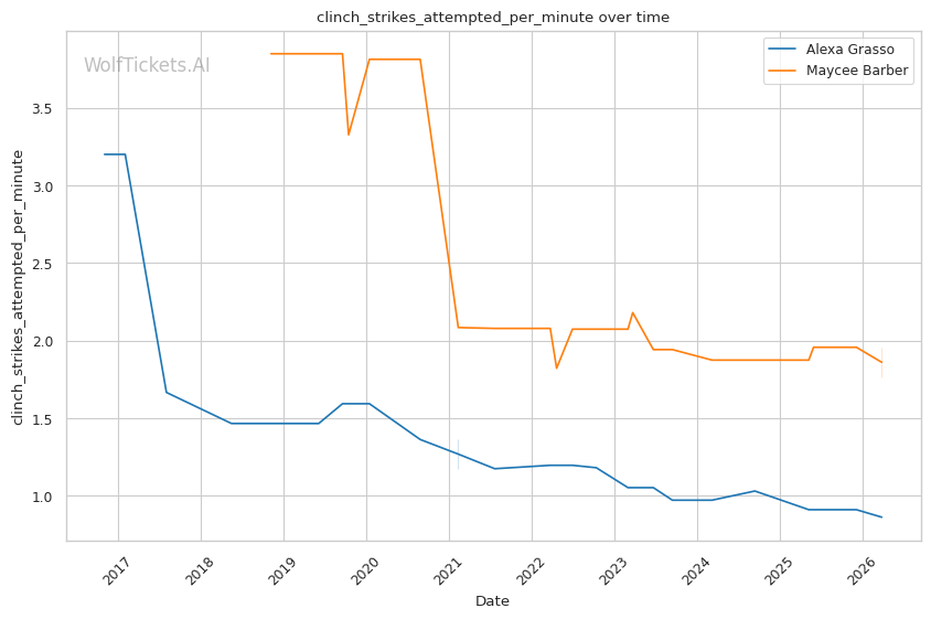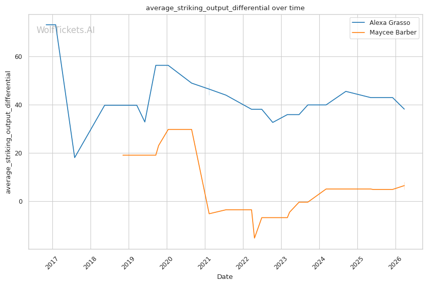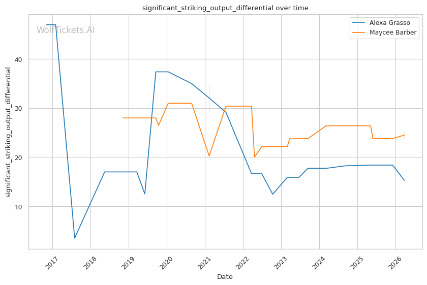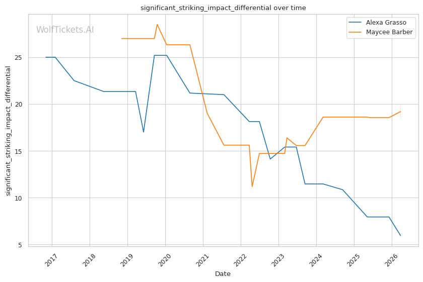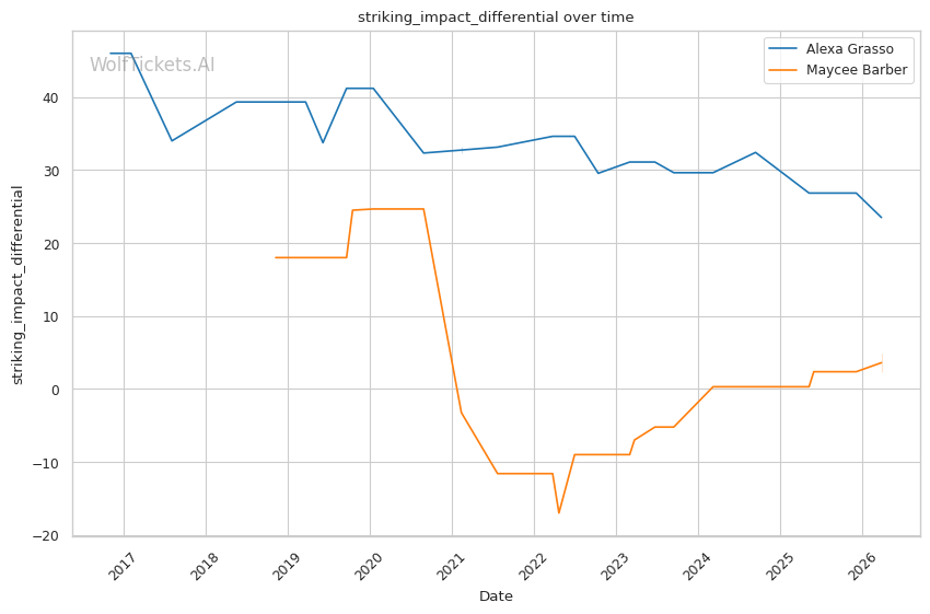 Grasso's recent significant striking impact differential is 7.57, while Barber's is 20.87. That gap in effective striking output suggests Barber is landing with more consequence.