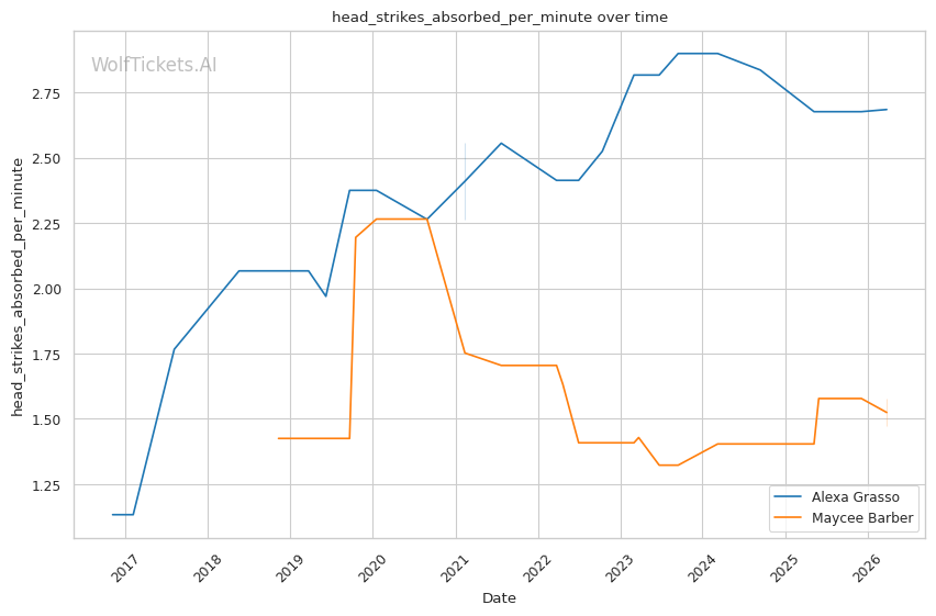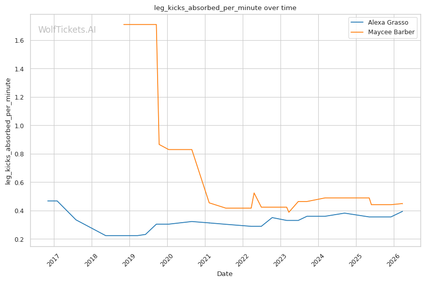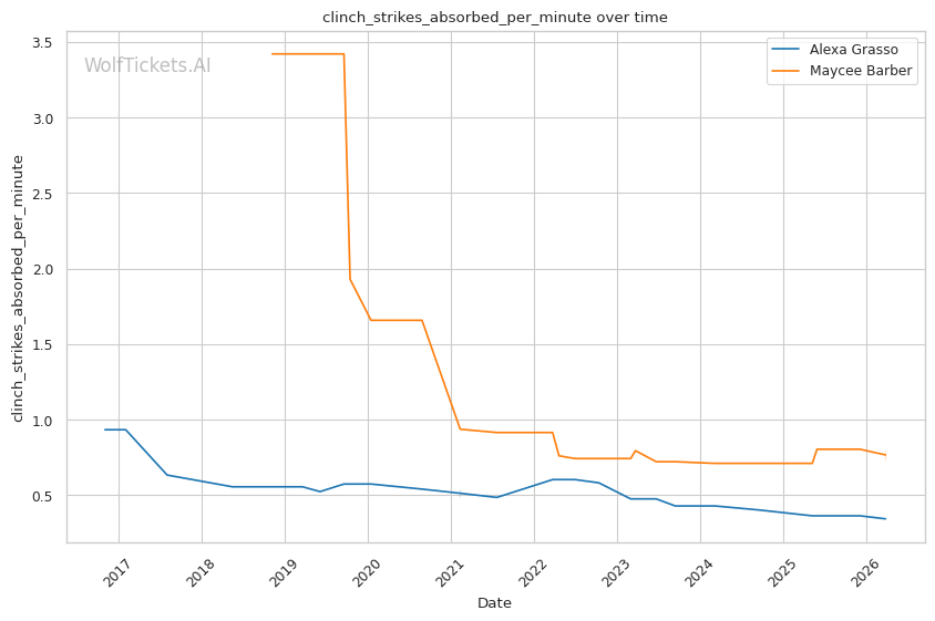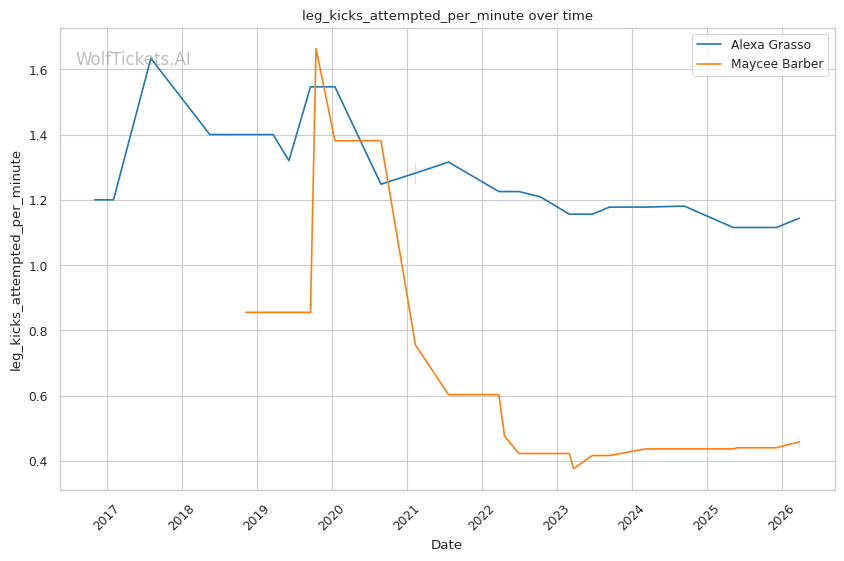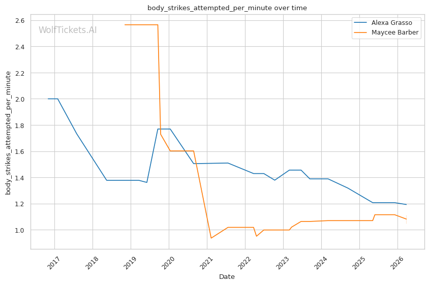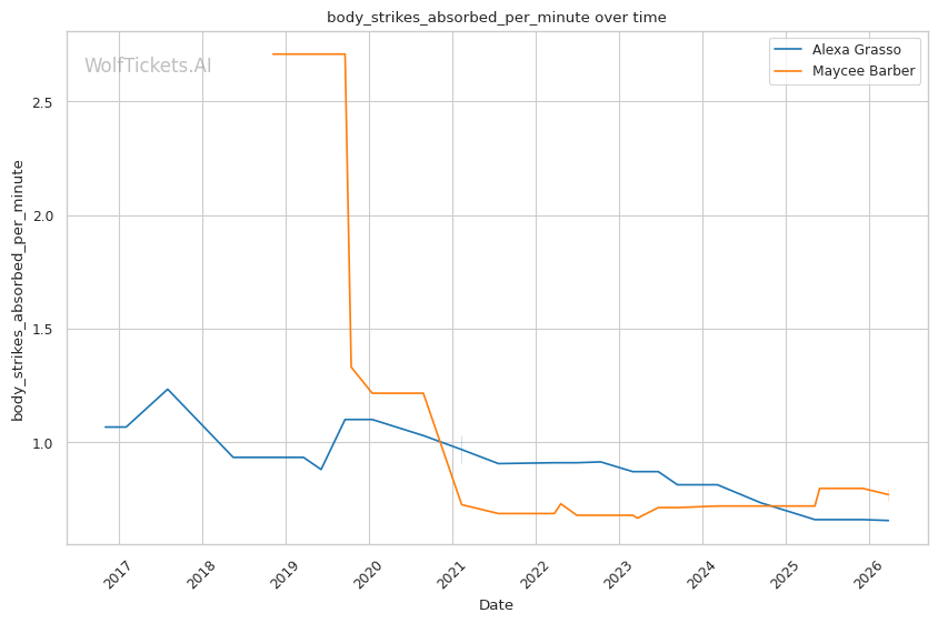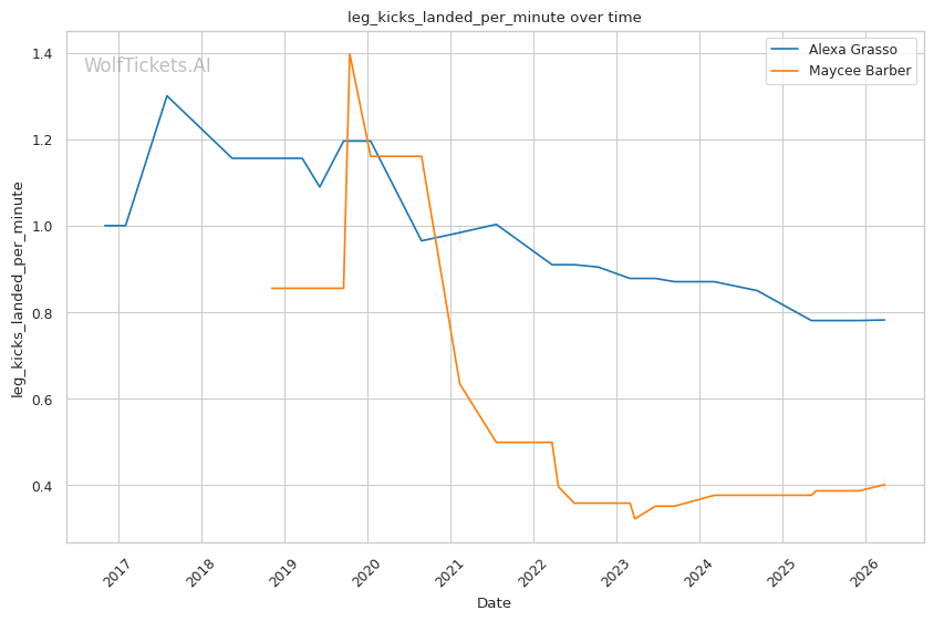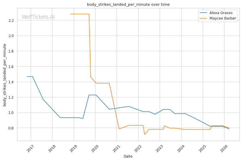 Championship Rounds (if applicable): Barber's cardio advantage is pronounced. Against Silva, she dominated the third round while her opponent faded. Against Eye, she was the fresher fighter in round 3, launching head kicks and controlling the action. Grasso's output has declined in later rounds recently, particularly against Shevchenko where she spent significant time on her back.