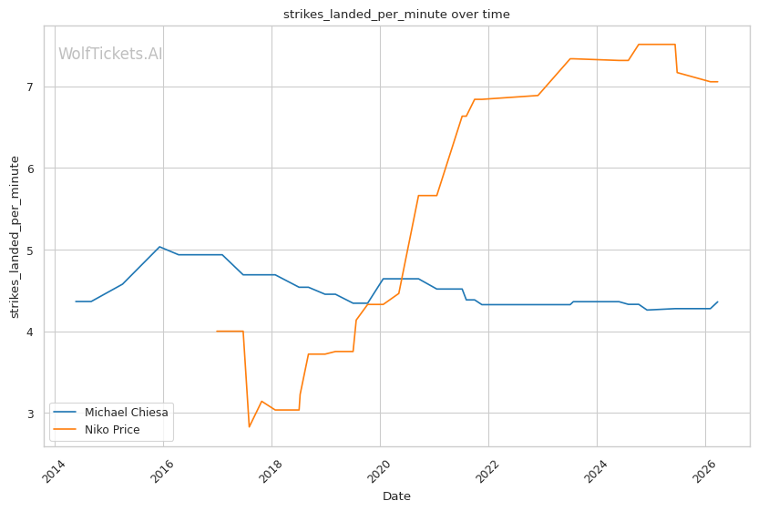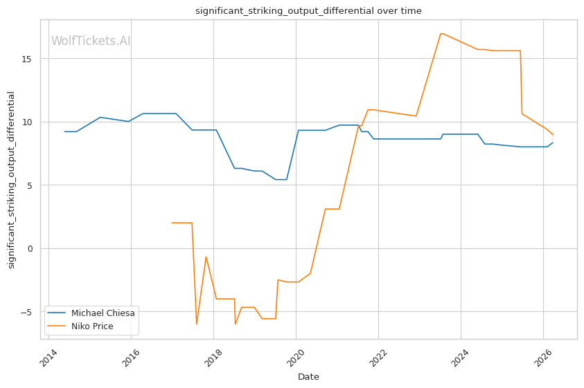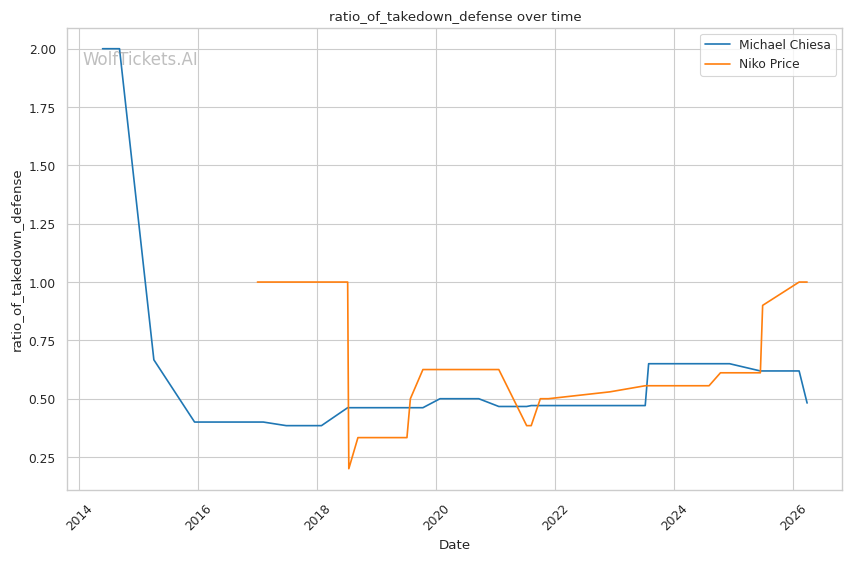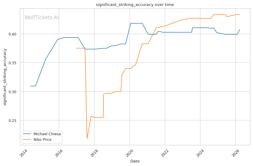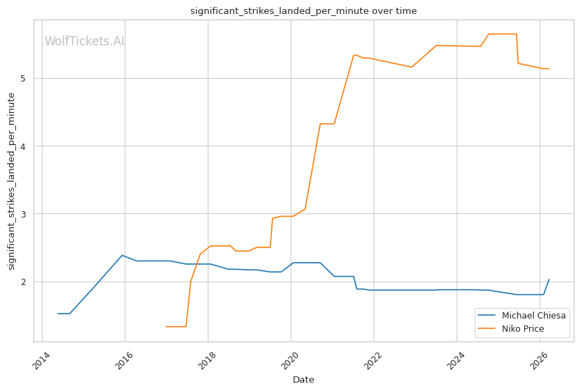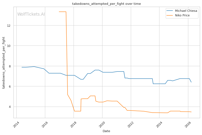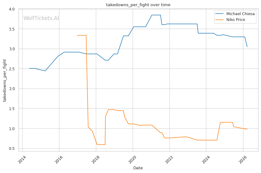 This matchup heavily favors Chiesa's grappling-based approach. Price's 62% takedown defense is a glaring weakness that Chiesa can exploit repeatedly. Chiesa averages 3.5 takedowns per fight in his recent bouts and has shown the ability to chain wrestling sequences effectively.