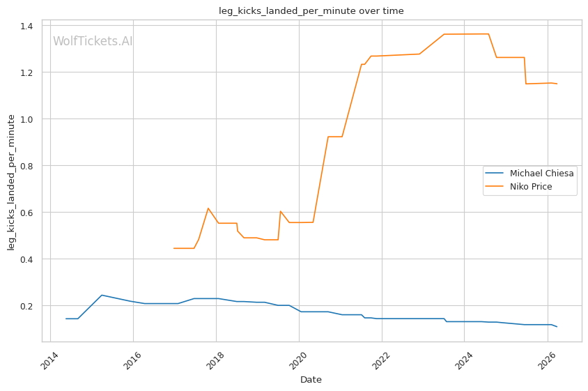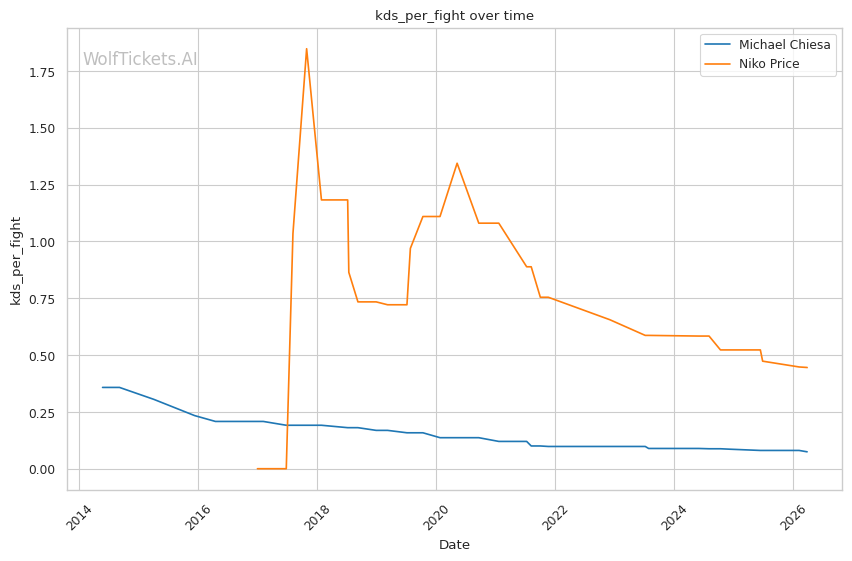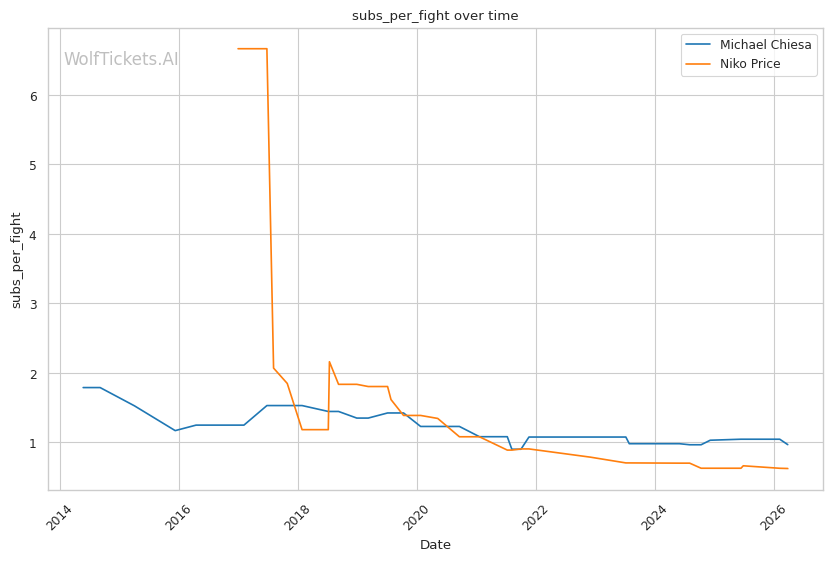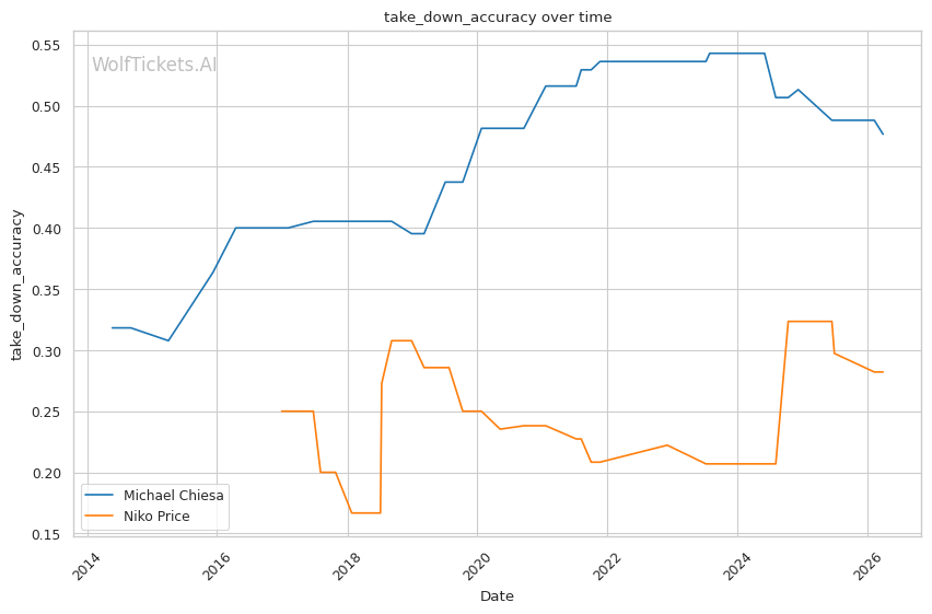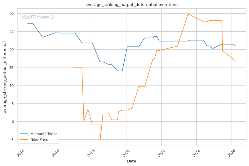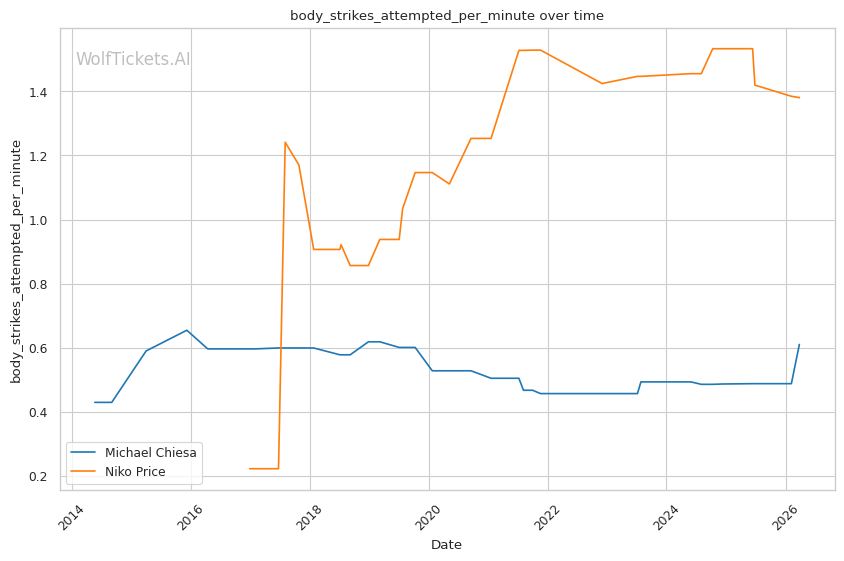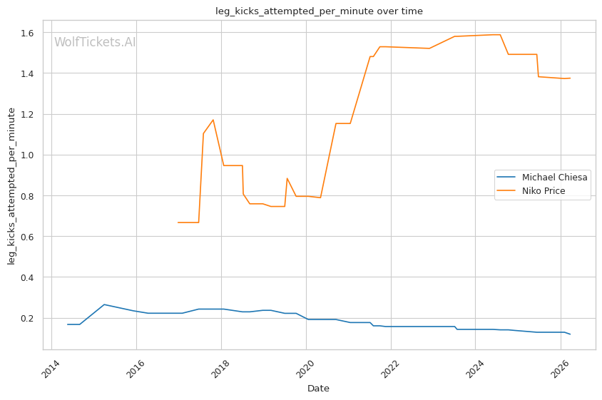 This matchup heavily favors Chiesa's grappling-based approach. Price's 62% takedown defense is a glaring weakness that Chiesa can exploit repeatedly. Chiesa averages 3.5 takedowns per fight in his recent bouts and has shown the ability to chain wrestling sequences effectively.