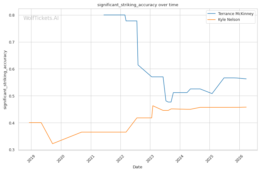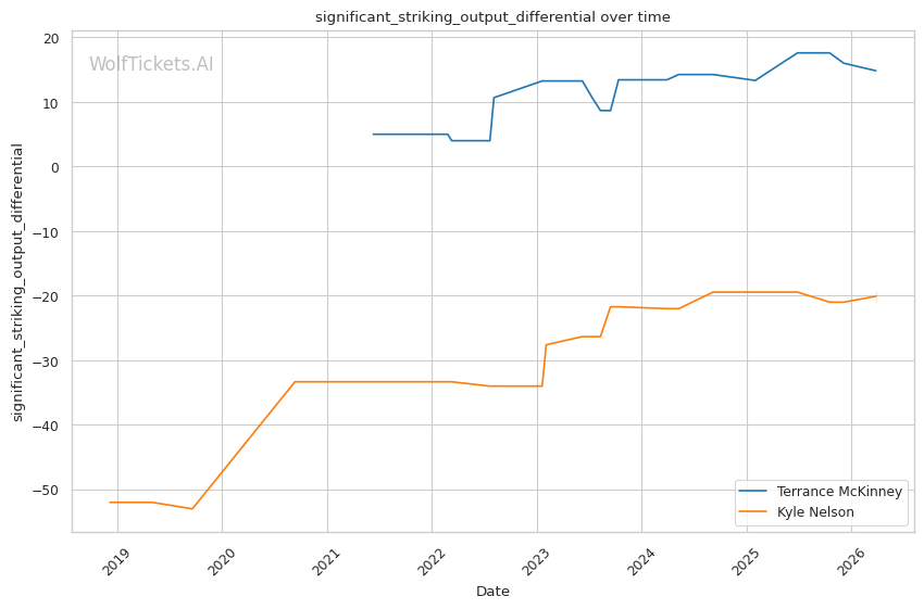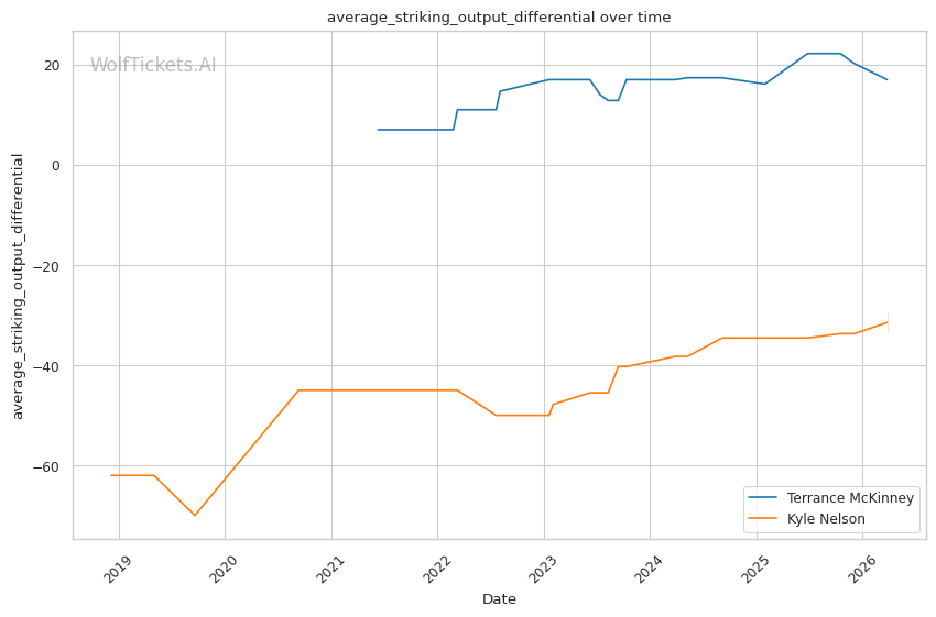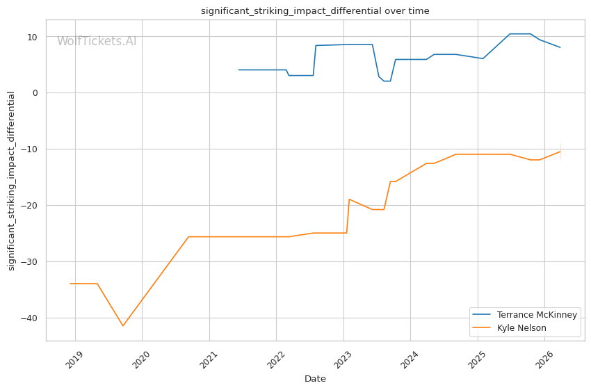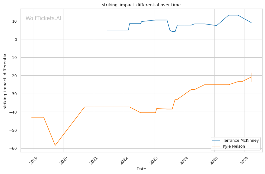 Significant Striking Impact Differential increased the score by 3.0. McKinney's +8.0 differential dwarfs Nelson's -9.09, showing he lands far more damaging strikes than he absorbs.
