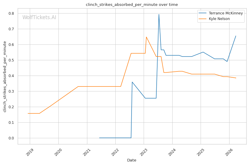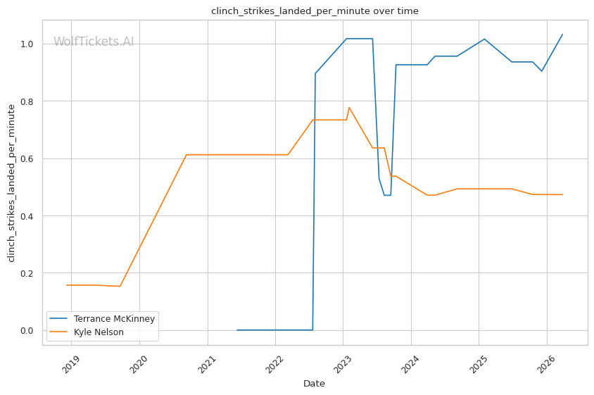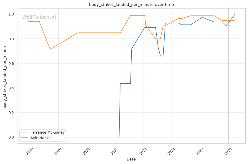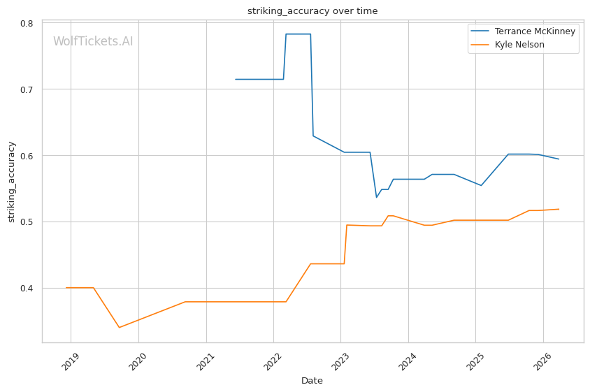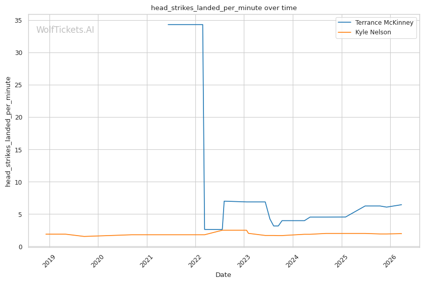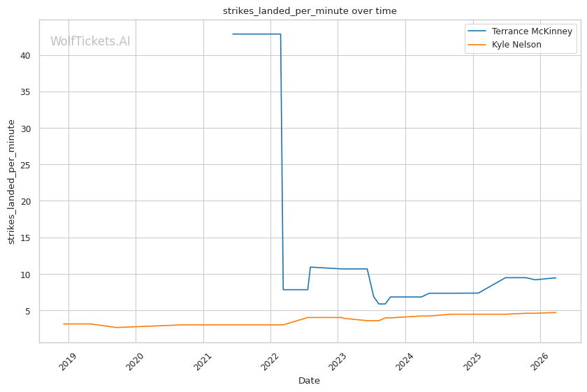 McKinney's blitzing forward pressure and power punching could overwhelm Nelson's defensive gaps. Nelson absorbs 2.52 head strikes per minute and has shown vulnerability to being hurt early. McKinney's stepping left straight and overhand combinations could catch Nelson before he establishes his counter-timing. The flying knee entries that hurt Duncan could also trouble Nelson, who has shown susceptibility to damage when pressured.
