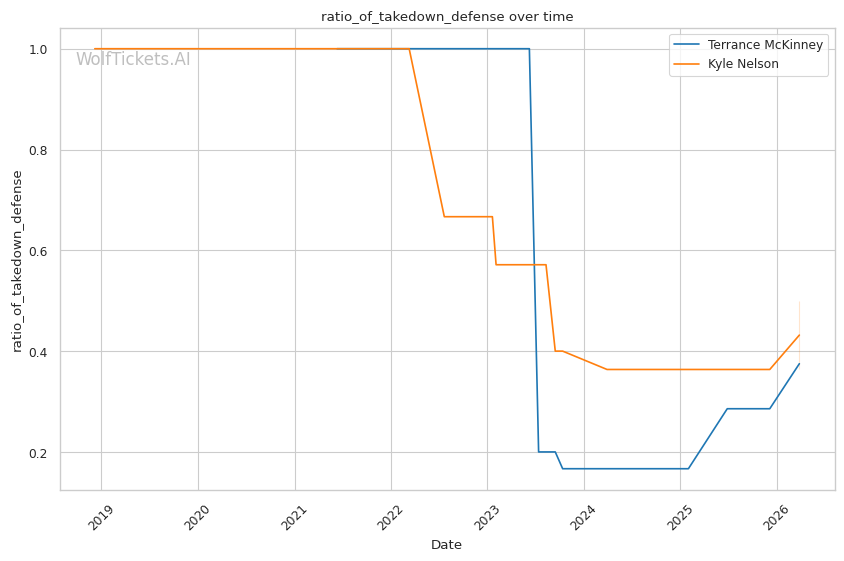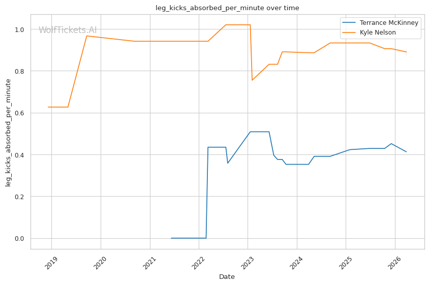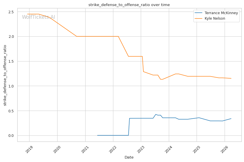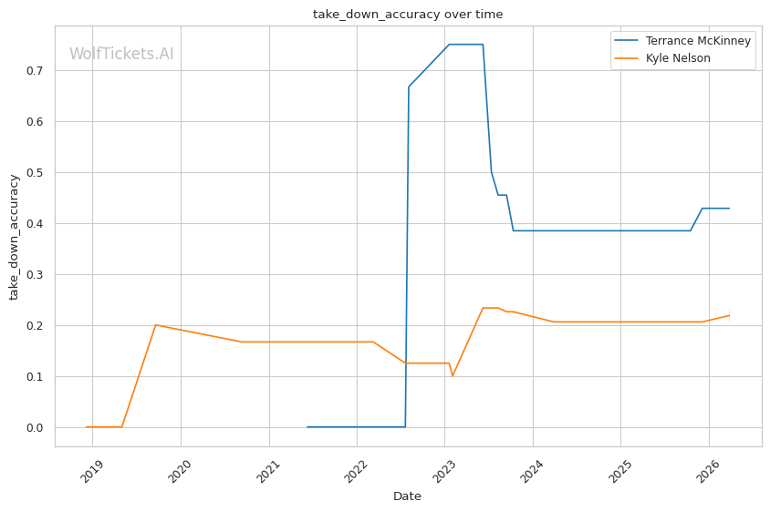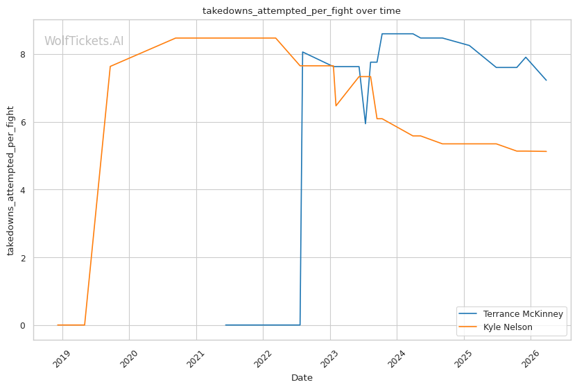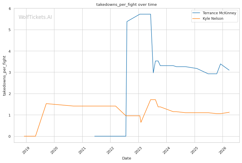 Recent Takedowns Attempted per Fight increased the score by 2.0. McKinney's 8.33 recent takedown attempts per fight give him a grappling threat Nelson may struggle to handle.