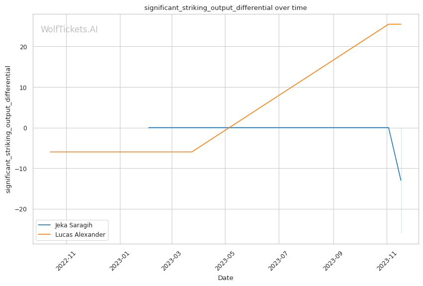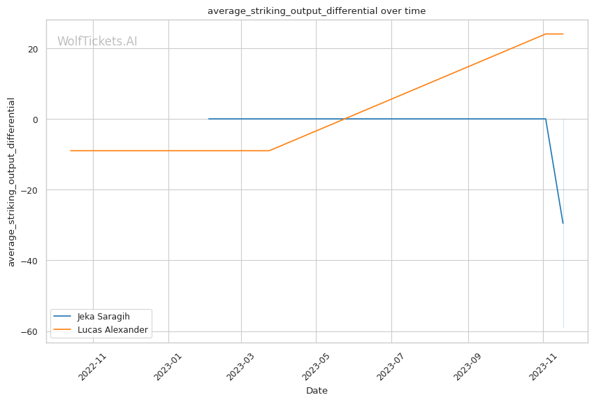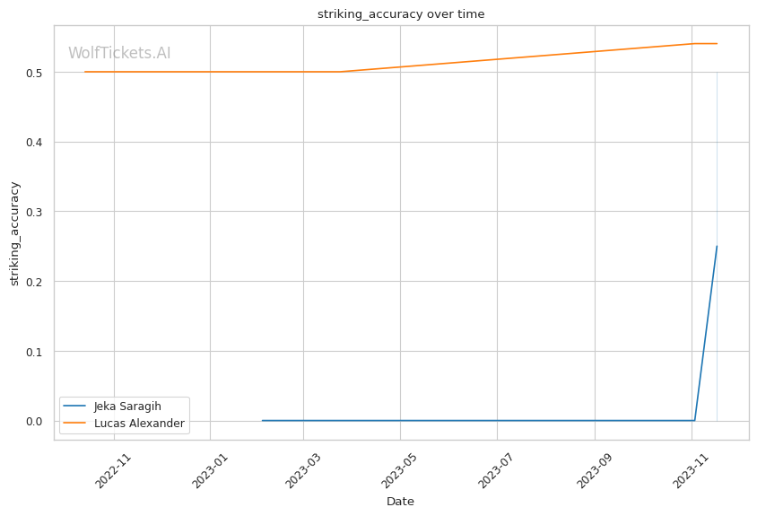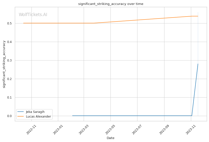 Lucas Alexander's superior striking stats, combined with Jeka Saragih's recent KO/TKO loss and less effective striking game, justify WolfTicketsAI's prediction for an Alexander win. Alexander's striking ability, particularly in head strikes, and his favorable striking differentials, suggest he has the edge in this matchup. Saragih’s recent KO/TKO loss is a significant factor in assessing his chances, as it raises questions about his resilience and defense against a striker like Alexander.