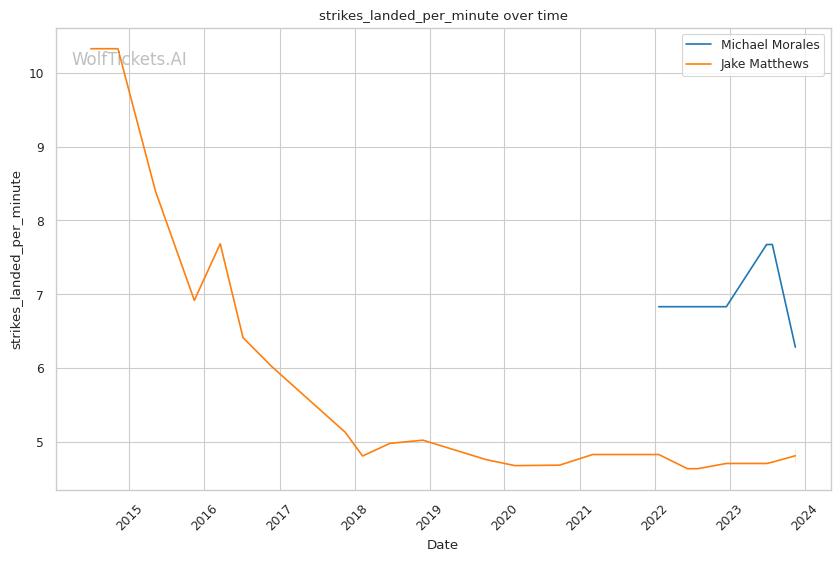 Matthews, with a 19-6 record, brings more experience but a less pristine record. His recent fights show a mixed bag of results: three wins (two by decision, one KO/TKO) and two losses (one by decision, one by submission). Notable in Matthews's skillset is his grappling - he has a higher submission rate (0.6703 per fight) and a solid takedown game (1.7130 takedowns per fight). His striking is less dominant than Morales, landing 2.4677 head strikes per minute with a striking accuracy of 0.5481. However, his significant striking defense is higher (0.6090), which might help against Morales's aggressive striking.