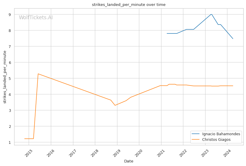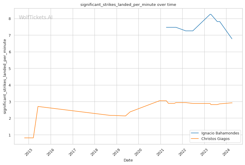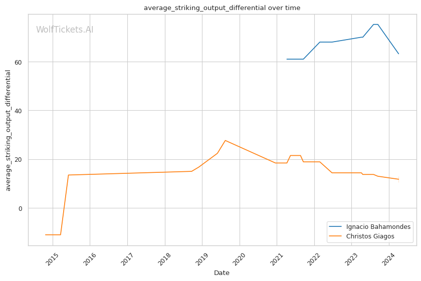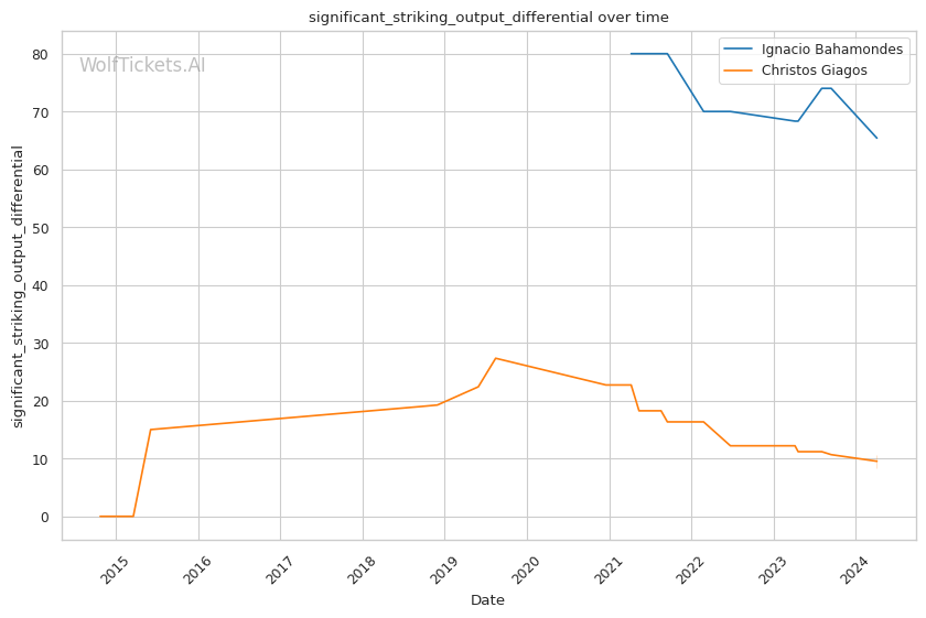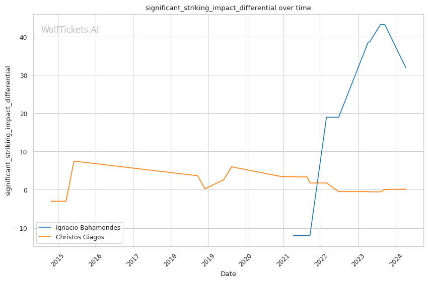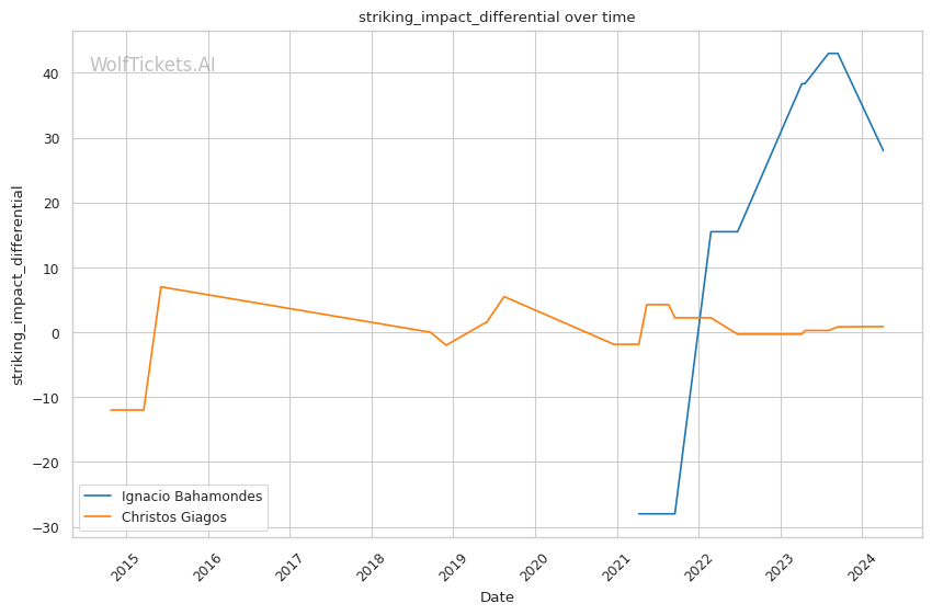 Bahamondes has strong advantages in striking metrics like Significant Striking Impact Differential. His strikes clearly do more damage on average than Giagos's.