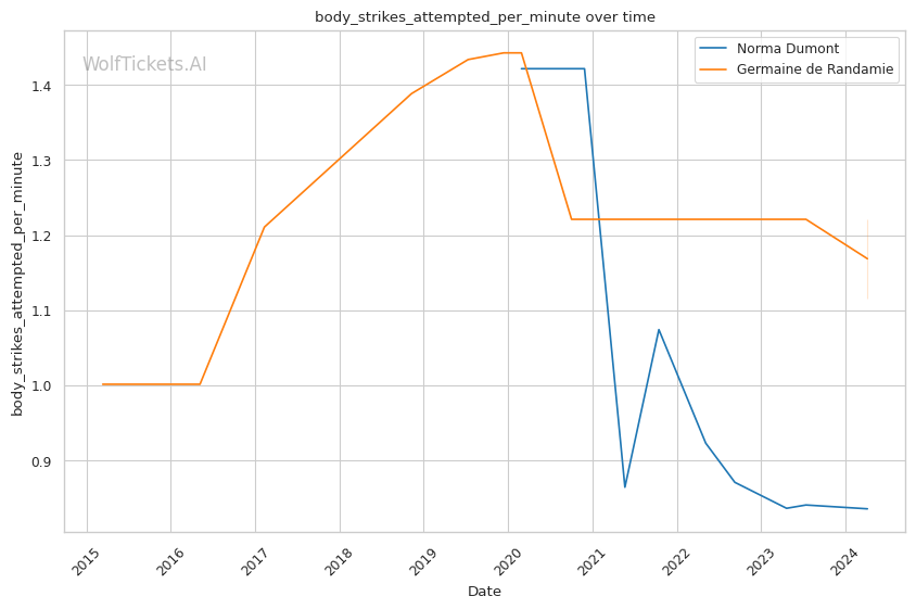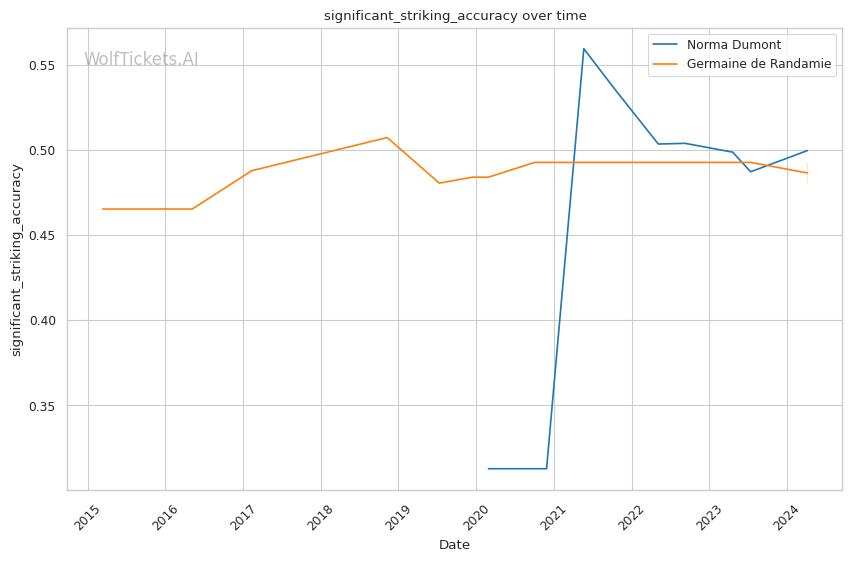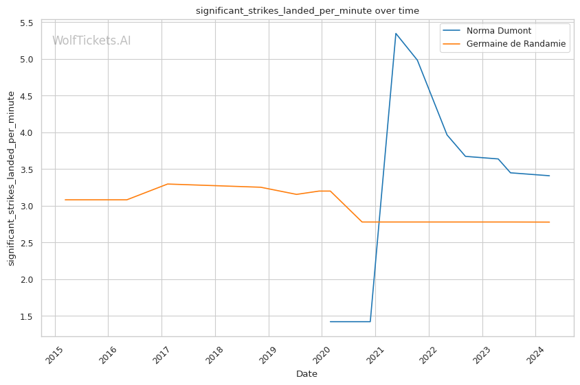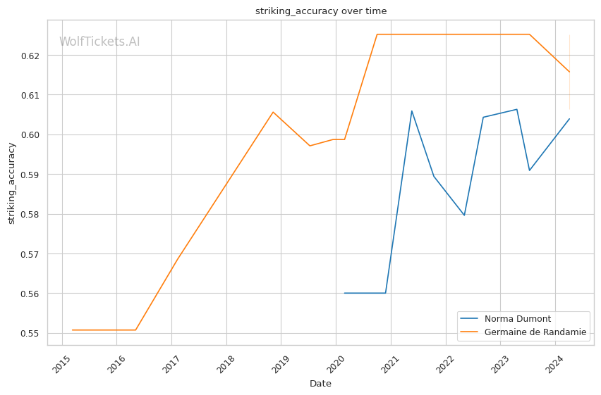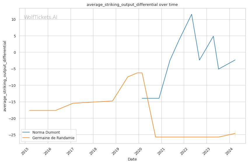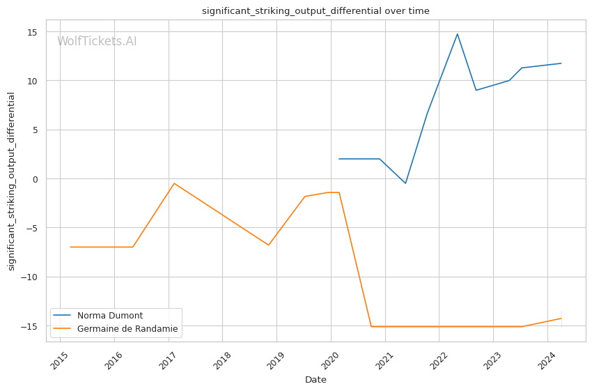Other variables like Dumont's higher recent significant striking impact differential (+23.81 vs +6.34) and superior recent takedown attempts per fight (2.34 vs 0.19) contribute to her favorable projection. However, de Randamie's striking output and accuracy pose a threat that Dumont must navigate carefully.