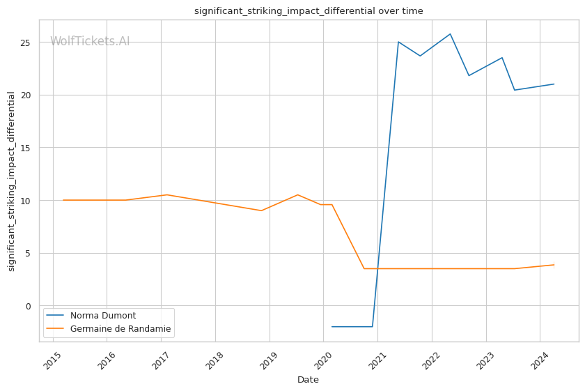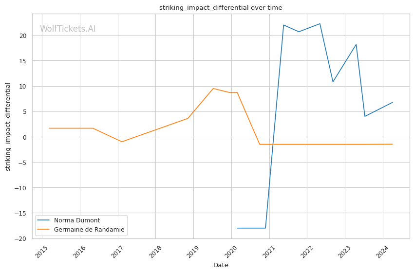 Dumont's significant striking impact differential of +21 is another key factor, bumping the score by 4.0 points. She lands impactful strikes at a higher rate compared to the strikes she absorbs, which bodes well for her chances. De Randamie's differential is lower at +4.22, highlighting Dumont's edge in striking potency.