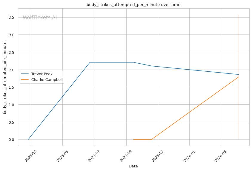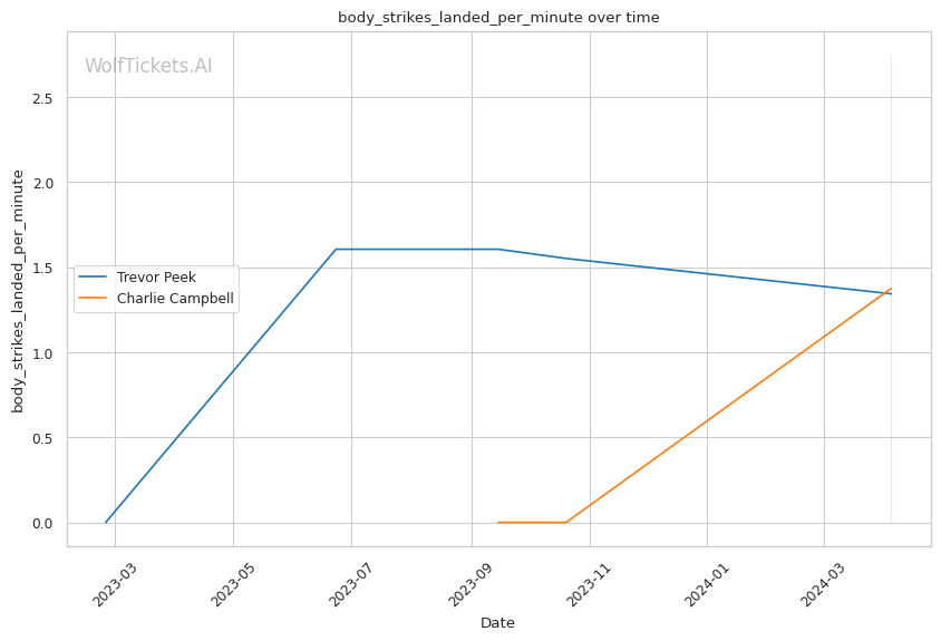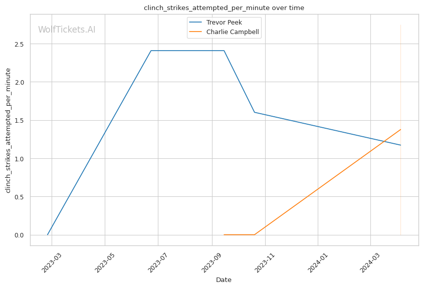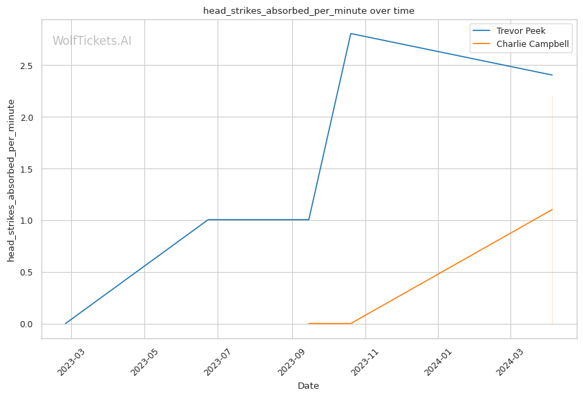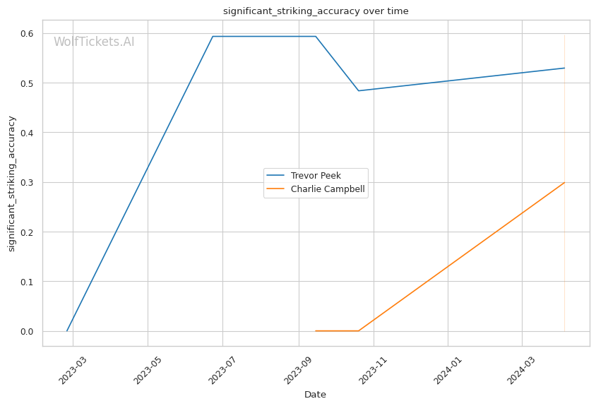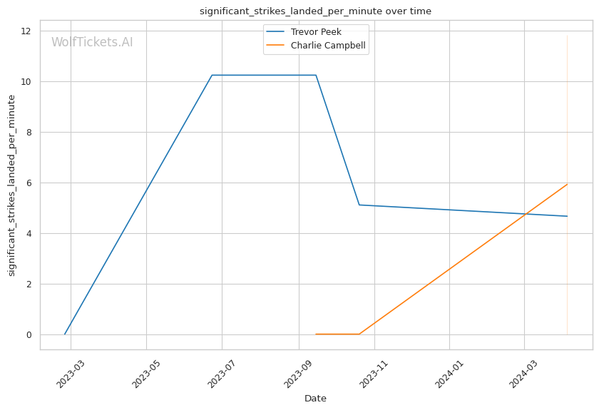 This matchup pits two high-output strikers against each other, but Charlie Campbell seems to hold the edge in terms of sheer volume and defensive capabilities. Campbell lands over twice as many significant strikes per minute as Peek (11.83 vs 4.66) while absorbing fewer head strikes (2.20 vs 2.40).