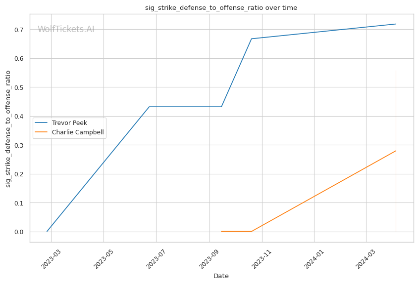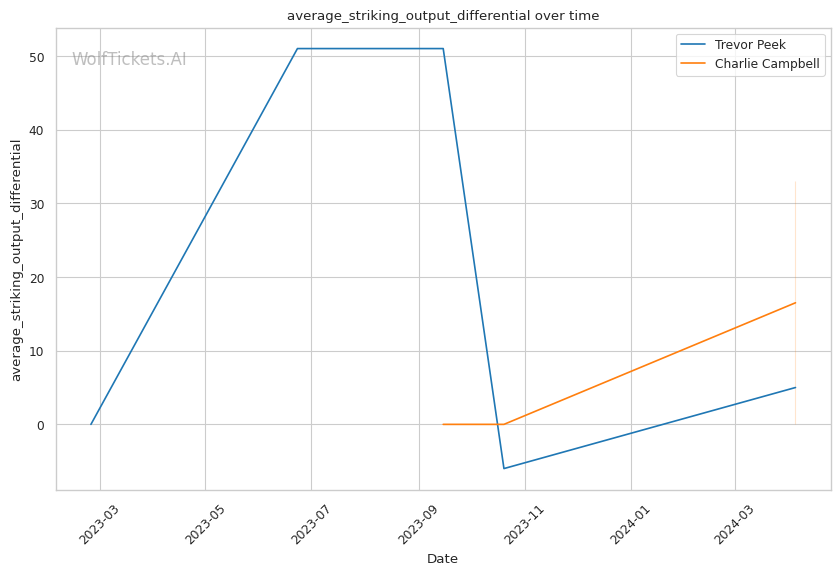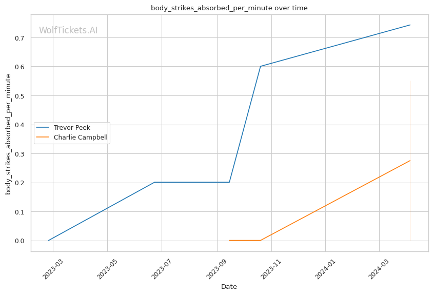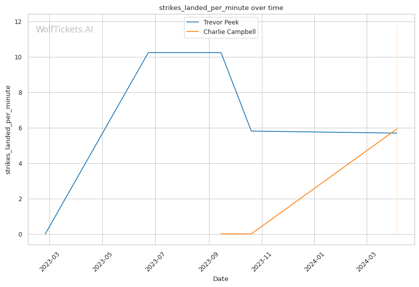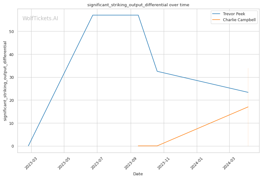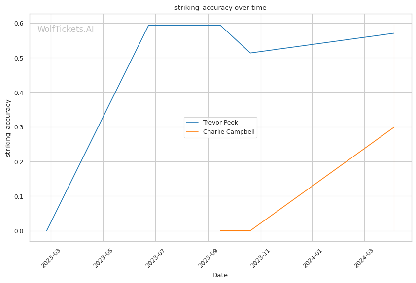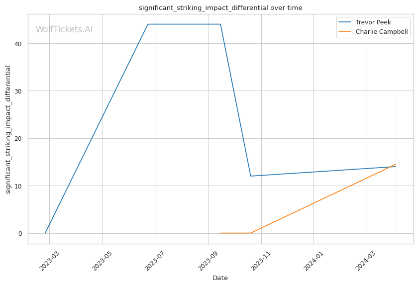 This matchup pits two high-output strikers against each other, but Charlie Campbell seems to hold the edge in terms of sheer volume and defensive capabilities. Campbell lands over twice as many significant strikes per minute as Peek (11.83 vs 4.66) while absorbing fewer head strikes (2.20 vs 2.40).