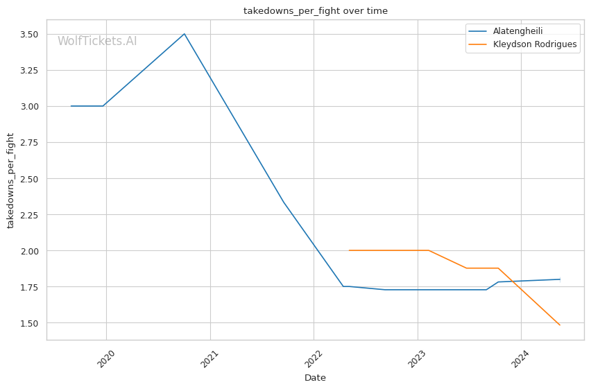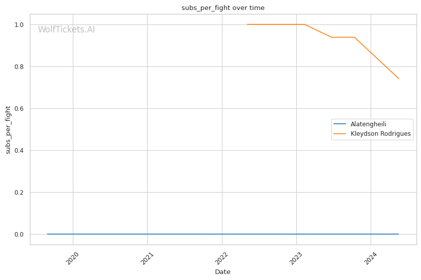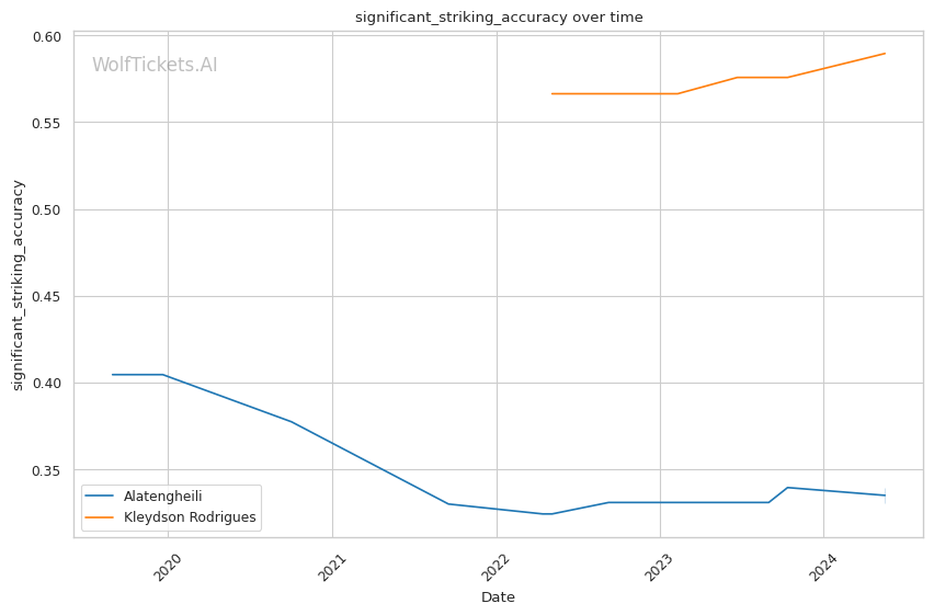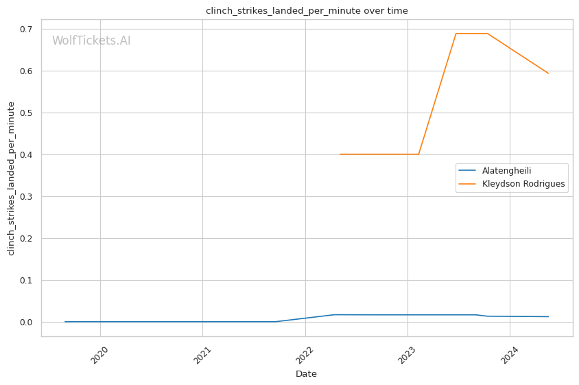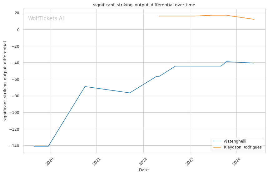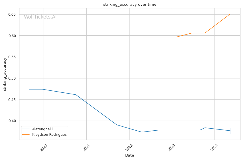 While Kleydson Rodrigues is favored by oddsmakers and has a striking volume advantage, WolfTicketsAI gives him just a narrow edge to defeat Alatengheili. The model sees Alatengheili's striking defense and overall UFC experience as key factors.