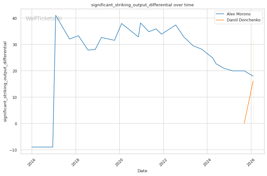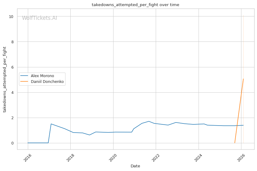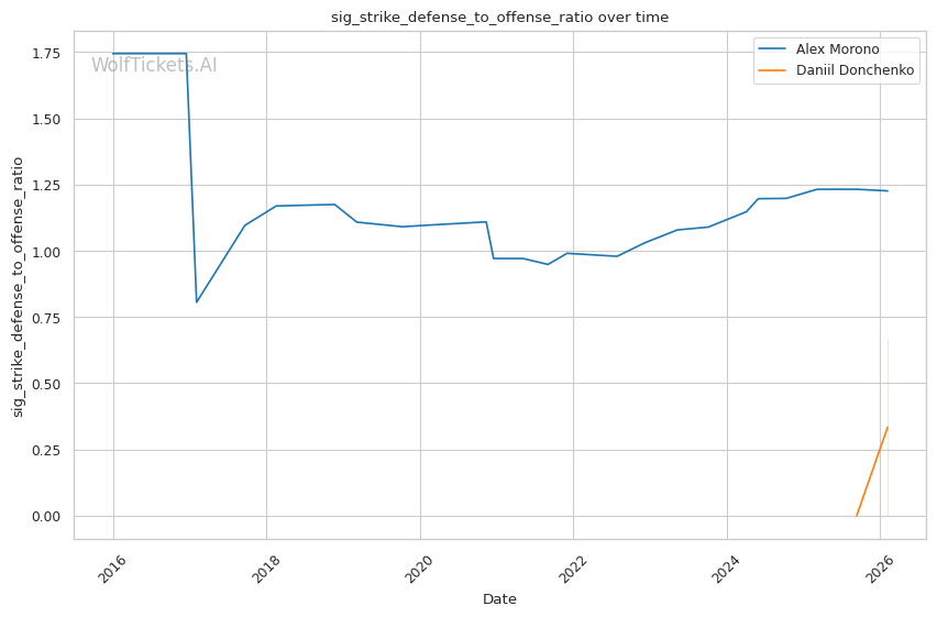 Donchenko's Advantages: - His 6.52 head strikes landed per minute dwarfs Morono's 3.99. If he can establish his jab and maintain output, he'll outwork Morono on the scorecards. - The constant takedown threat (10+ attempts per fight) could freeze Morono's bouncing entries, making him easier to hit. - Donchenko's 72% striking defense is significantly better than Morono's 53%, suggesting he's harder to hit clean.