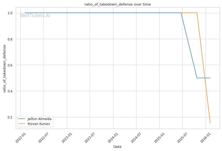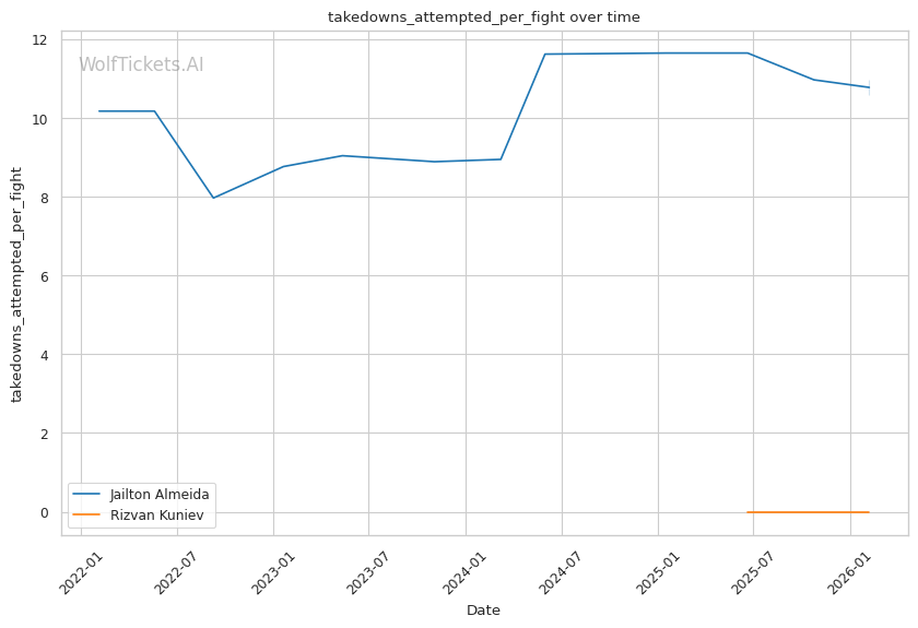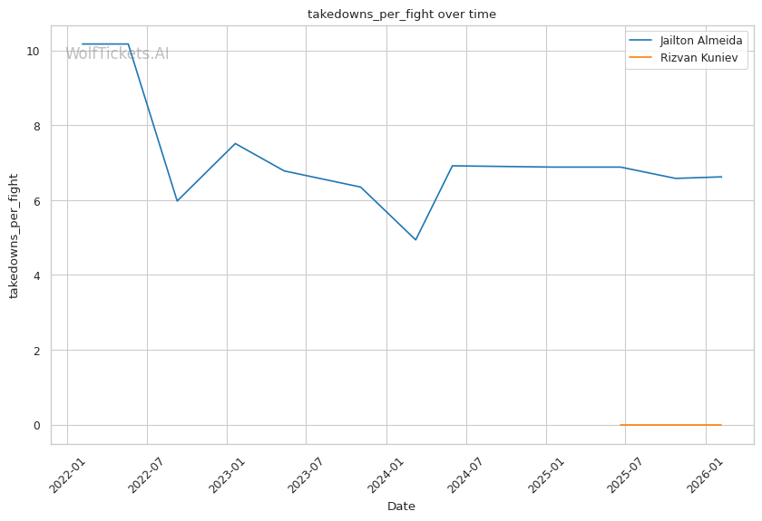 Takedown Volume Mismatch: Almeida attempts 10.58 takedowns per fight. Kuniev defended well against an injured Blaydes, but Almeida's volume and chain wrestling are different challenges entirely.