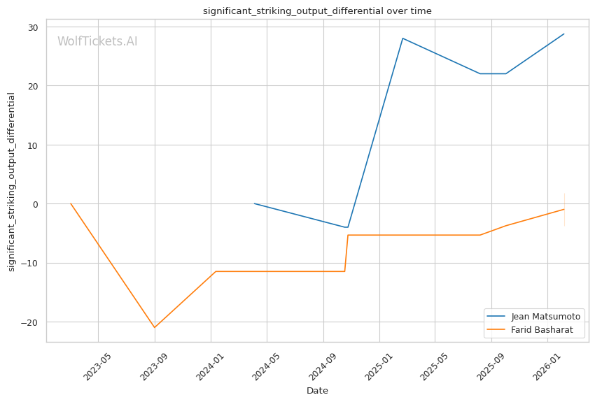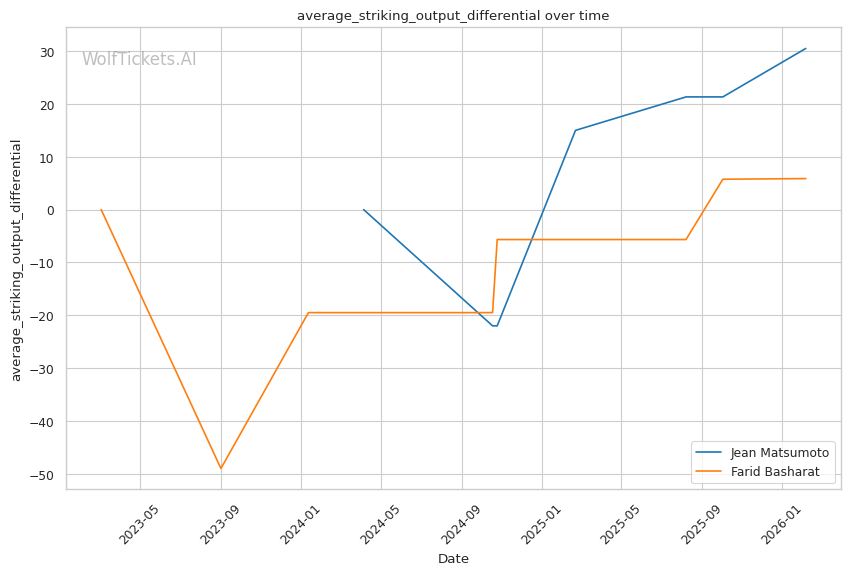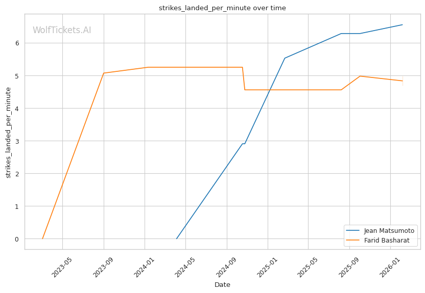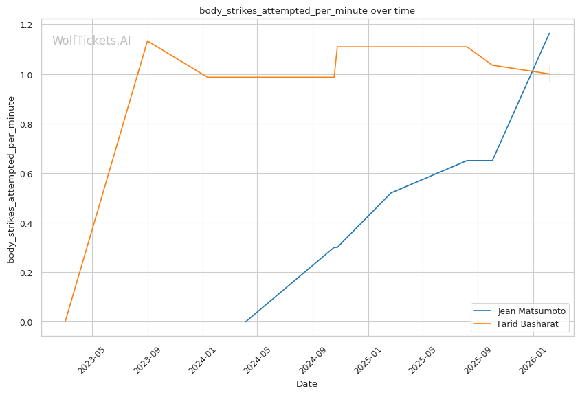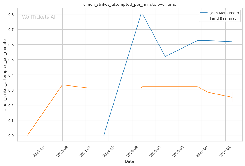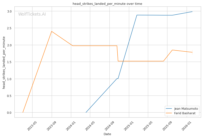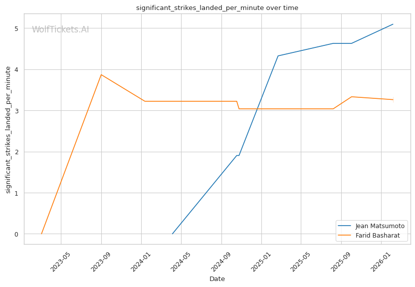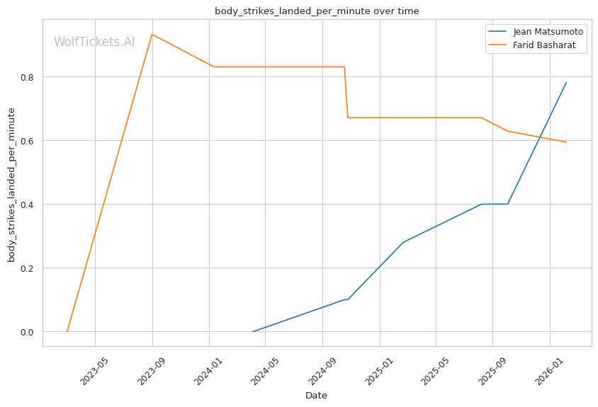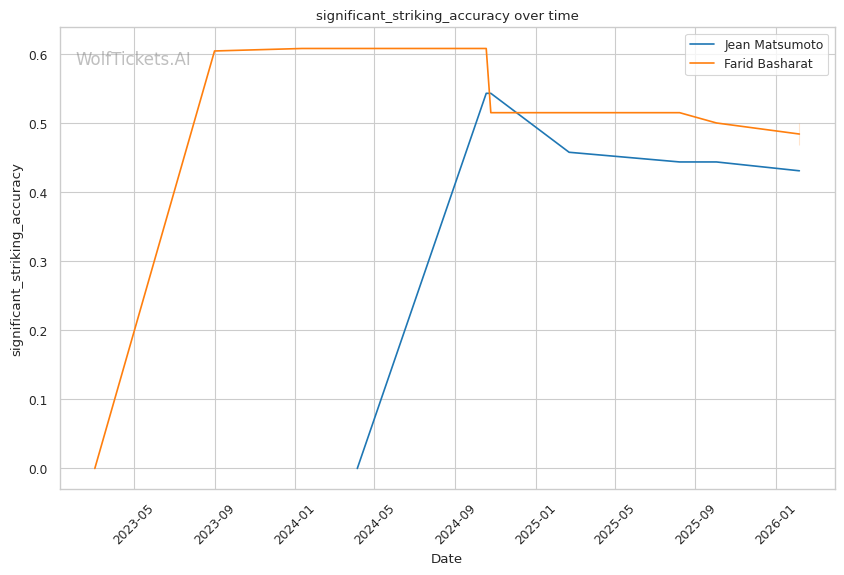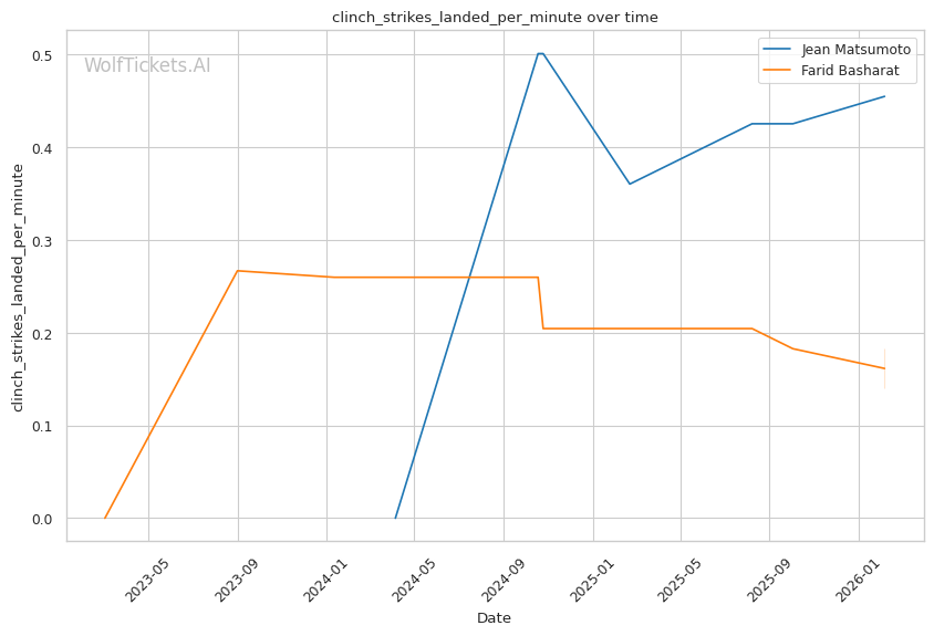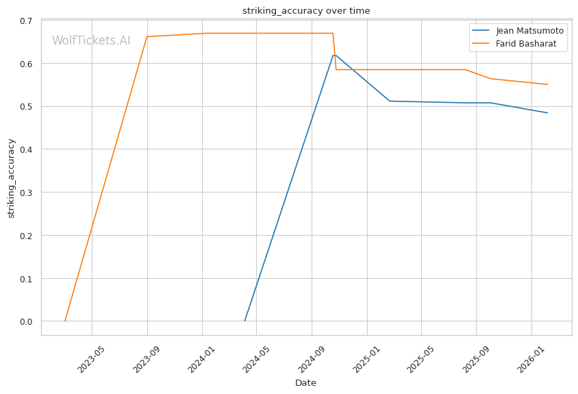Basharat has developed into a volume-based technical striker who prioritizes not getting hit. His significant striking defense percentage of 60.6% is notably higher than Matsumoto's 47.5%. He makes mid-fight adjustments well, as his jab improvement within the Hugo fight demonstrated.