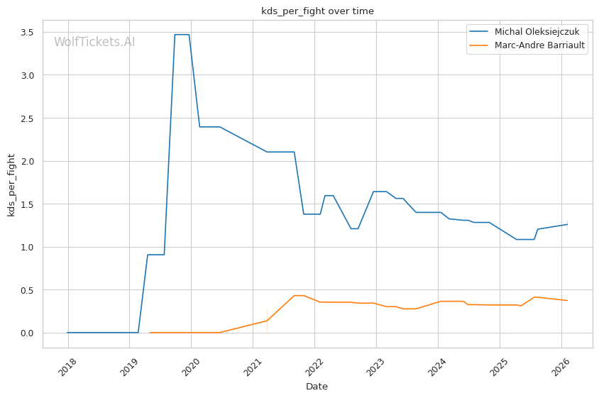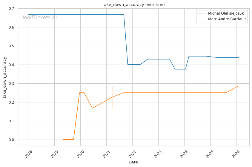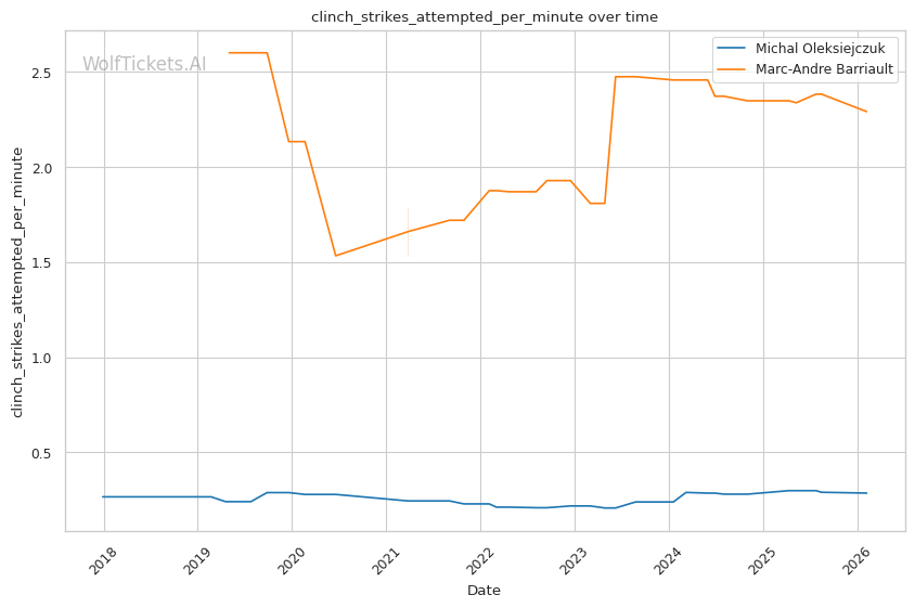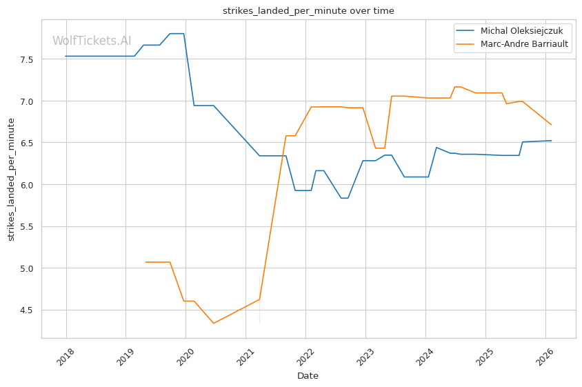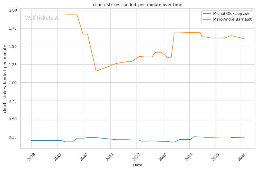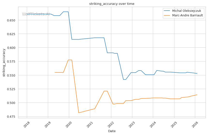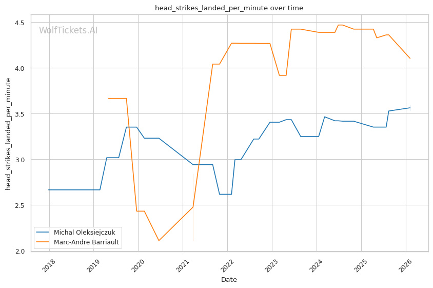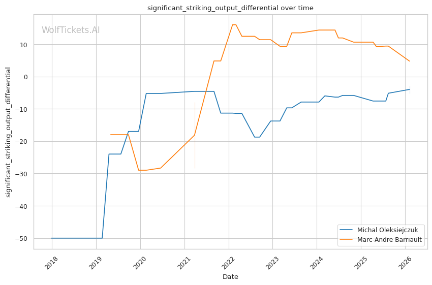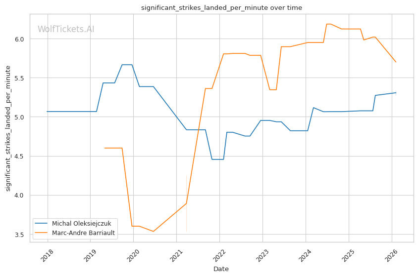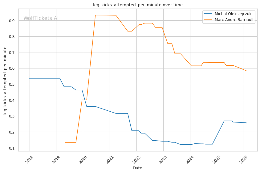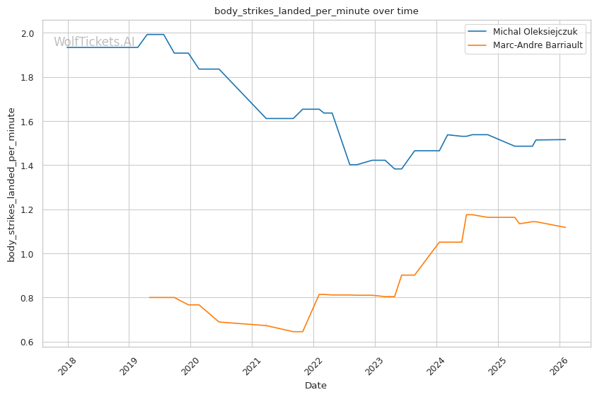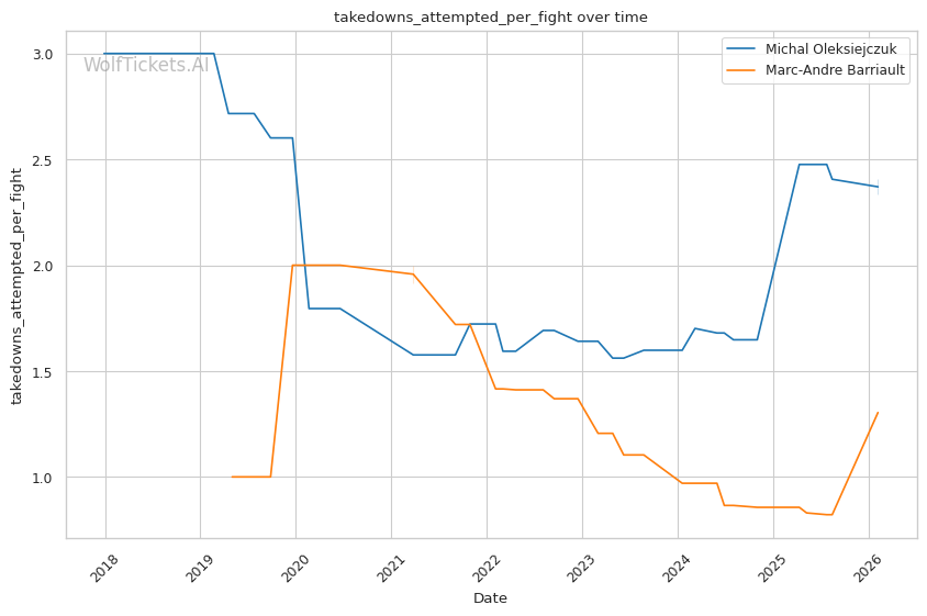 Oleksiejczuk's level of competition caveat applies: His recent wins have come against Meerschaert, Dumas, Brundage, and Alvey. Barriault represents a slight step up but remains within Oleksiejczuk's wheelhouse as a forward-moving striker with defensive holes.