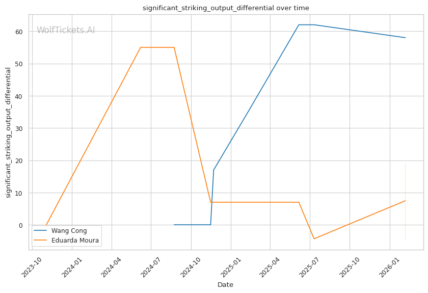 Wang has shown excellent cardio management. Against Brasil, she maintained offensive pressure through all four rounds, breaking Brasil's nose in round three and continuing to implement her game plan. If this fight reaches the third round with Moura unable to secure meaningful ground control, Wang should cruise to a decision.