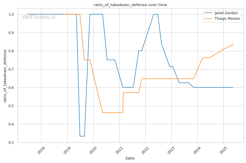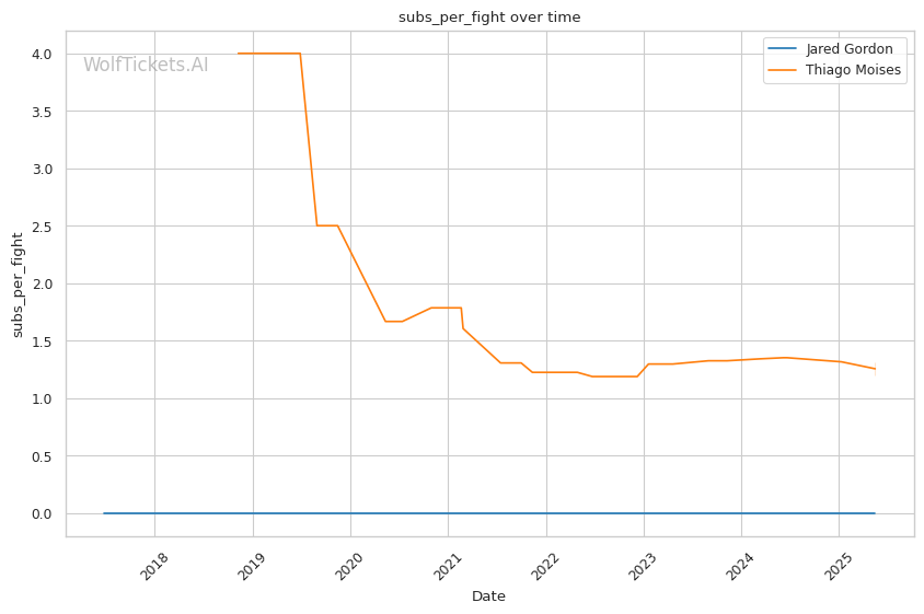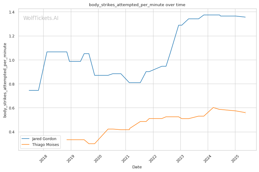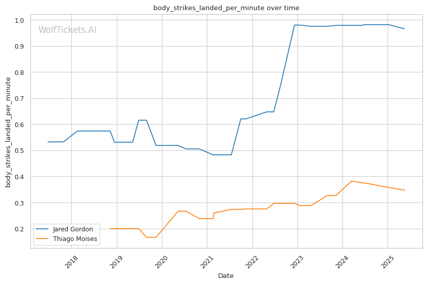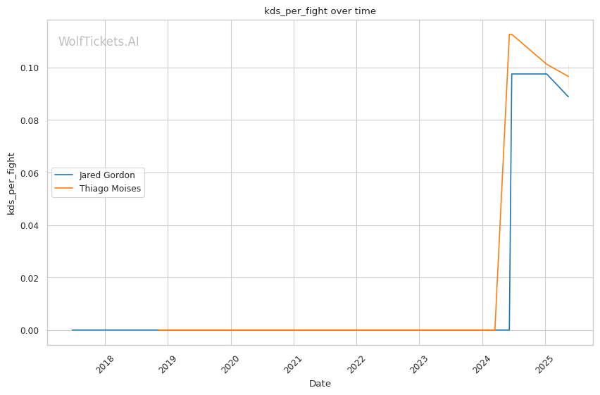 Mid-fight adjustments: If Gordon's initial pressure is successful, expect Moises to increase his wrestling attempts to change the dynamic. Gordon's defensive wrestling will be tested, particularly his ability to maintain position during scrambles without exposing his back. If Moises has success with leg kicks early, Gordon may be forced to adjust his entries, potentially switching to more wrestling-heavy approaches.