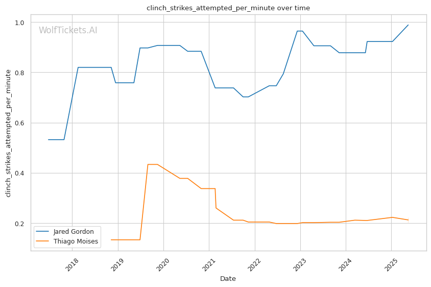 Gordon's pressure boxing and clinch control directly target Moises's vulnerability against the fence. Gordon excels at cutting the cage and forcing opponents into uncomfortable exchanges in tight quarters – precisely where Moises has shown defensive liabilities. The clinch exchanges will be particularly important, as Gordon's dirty boxing could neutralize Moises's grappling entries if he can maintain strong underhook control.