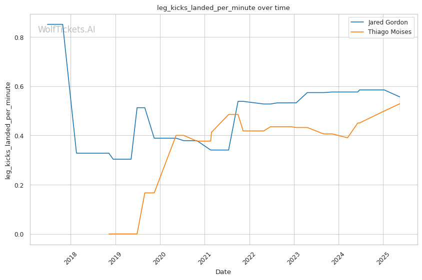 Gordon's relentless pressure, volume striking, and clinch control present a difficult stylistic matchup for Moises, who struggles when forced to fight off his back foot. While Moises possesses dangerous submission skills and increasingly effective calf kicks, Gordon's ability to cut the cage and force clinch exchanges should neutralize much of Moises's offensive arsenal. Gordon's tendency to expose his back during scrambles presents the biggest risk, but his improved defensive wrestling and stance switching should allow him to maintain his preferred range. WolfTicketsAI sees Gordon's pressure and striking impact as the deciding factors in what should be a competitive but clear decision victory.
