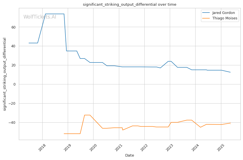 Gordon's high output in the early rounds matches poorly with Moises's tendency to start slowly. If Gordon can establish his pace and pressure early, Moises may find himself playing catch-up throughout the fight. However, if Moises can weather the early storm and find success with his calf kicks, Gordon's mobility could be compromised in later rounds.
