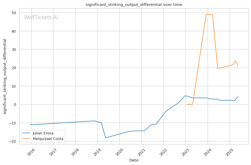 However, the model also identified factors working against Costa: - Odds decreased the prediction score by 8.0, indicating the betting market may be overvaluing Costa - Recent takedowns attempted per fight decreased the prediction score by 2.0, suggesting Costa's wrestling aggression could be a liability - TrueSkill decreased the prediction score by 1.0, reflecting Erosa's greater UFC experience