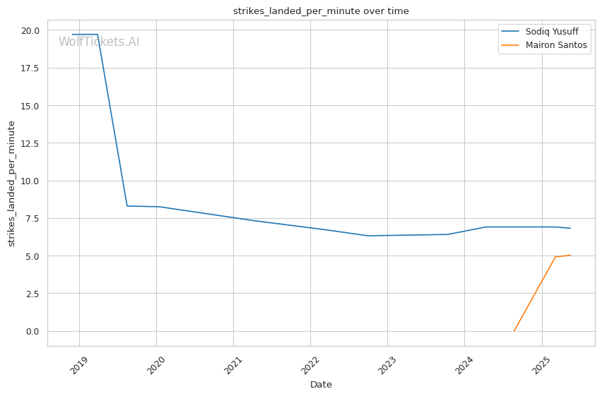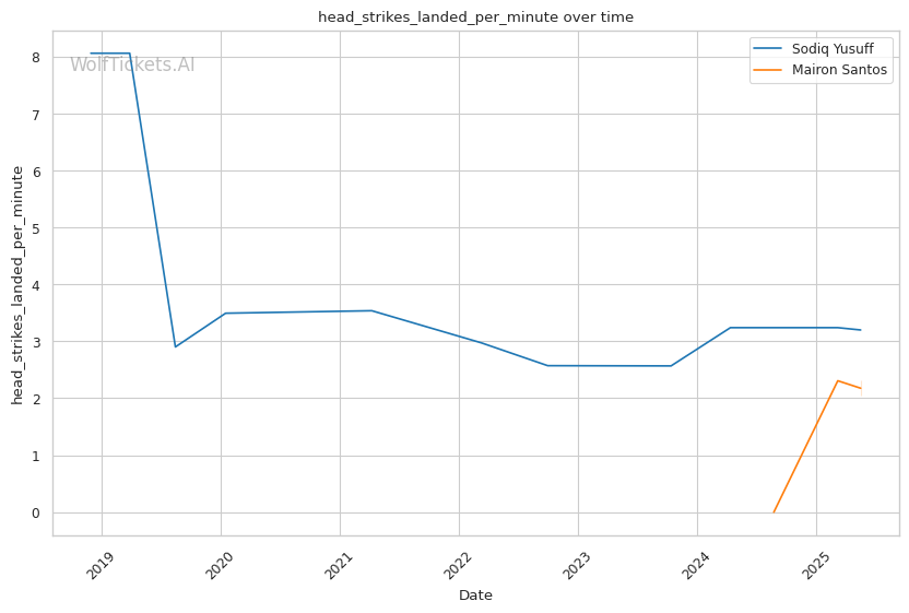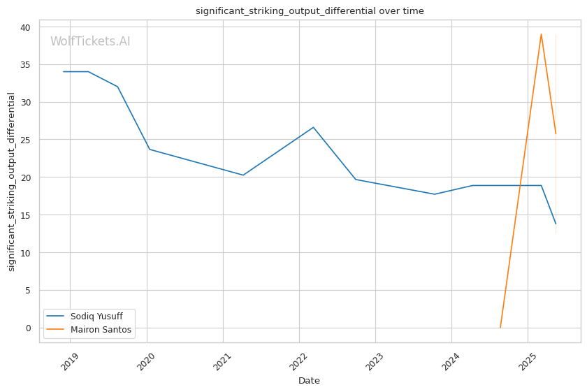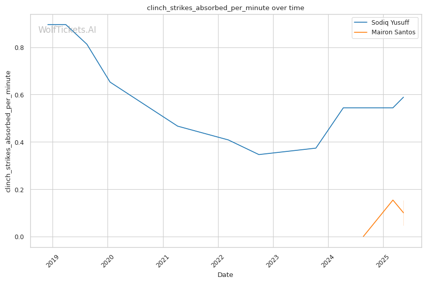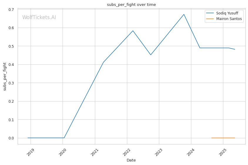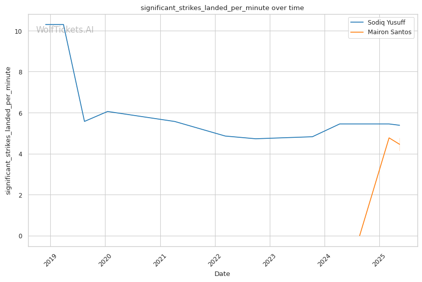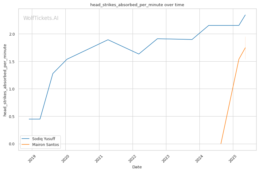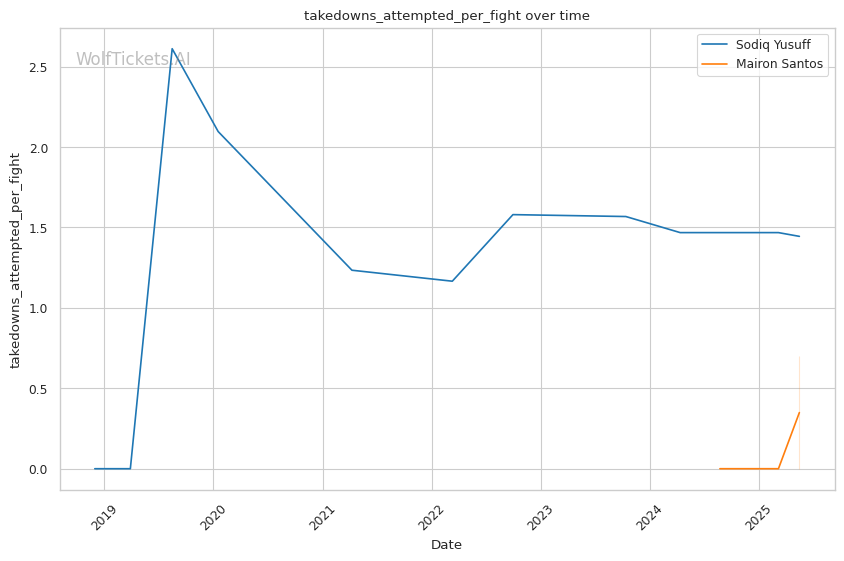 Technical Evolution: Santos has shown clear technical evolution in his first two UFC fights, particularly in his defensive lead hand techniques and ability to transition between defense and offense. Yusuff's technical approach has remained relatively consistent, though his effectiveness has declined in recent bouts.