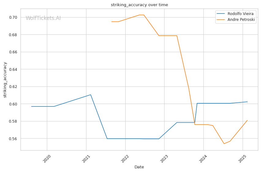 WolfTicketsAI has a perfect prediction record for Vieira, correctly calling his victories over Petrosyan and Brundage by submission. Predicting Petroski has been more mixed, with two significant misjudgments against Fremd and Maximov.