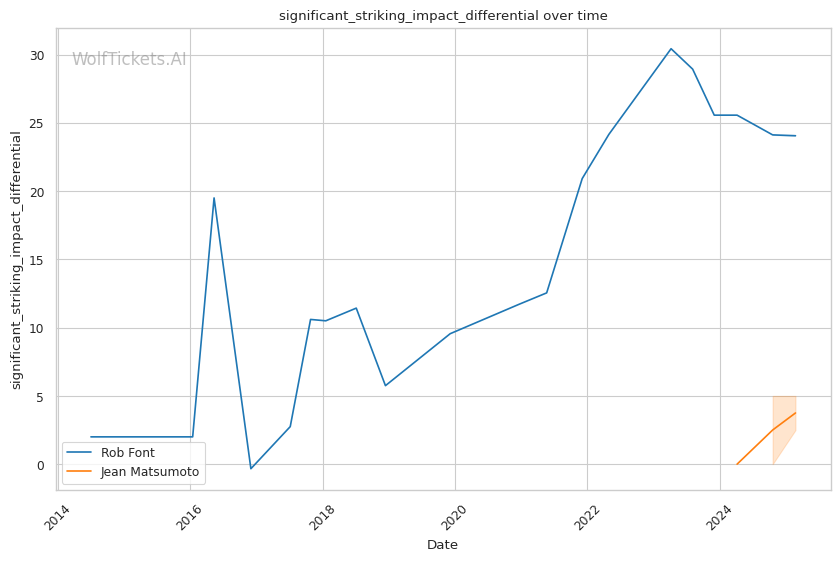 The prediction leans towards Matsumoto due to: - Significant Striking Impact Differential boosted his score, showcasing Matsumoto's ability to manage impactful strikes. - Odds for Matsumoto reflect his favored status and increased the prediction confidence. - Striking Defense Percentage indicated Font's potential vulnerabilities under Matsumoto's pressure.