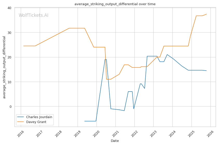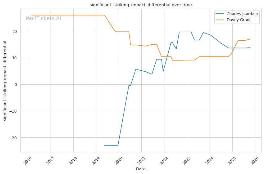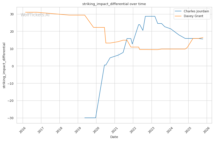 Significant Striking Impact Differential increased the score by 1.0—Jourdain's recent striking impact (13.16) shows he's landing more damaging strikes than absorbing, suggesting offensive effectiveness.