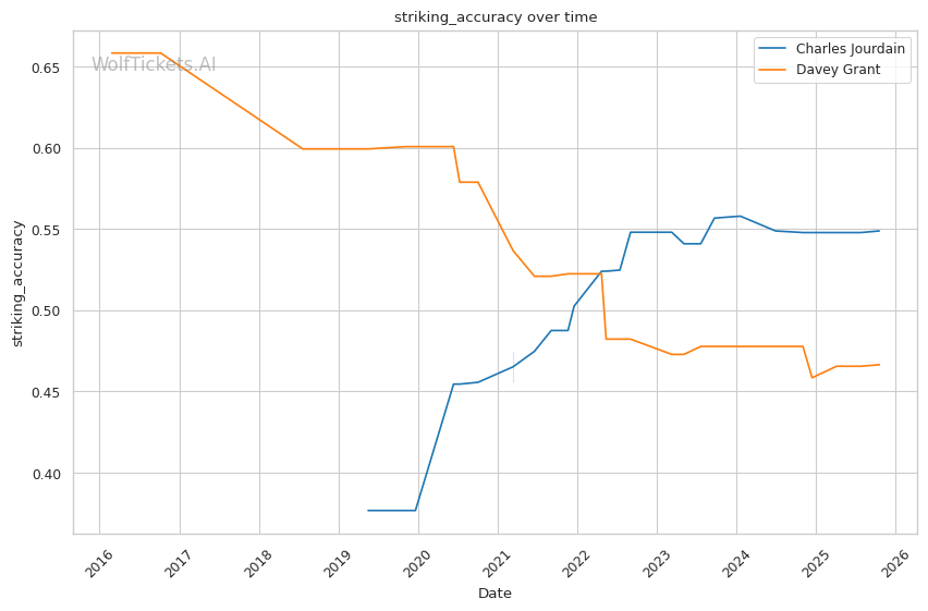 This history suggests caution—the model tends to underestimate both fighters' upset potential. Grant's recent streak of proving the model wrong (three straight wins as underdog or pick'em) is particularly notable. However, the model's confidence in Jourdain here is based primarily on the odds and striking metrics rather than historical prediction success.