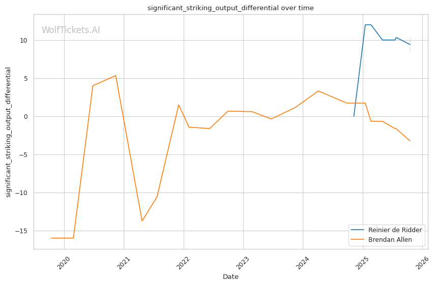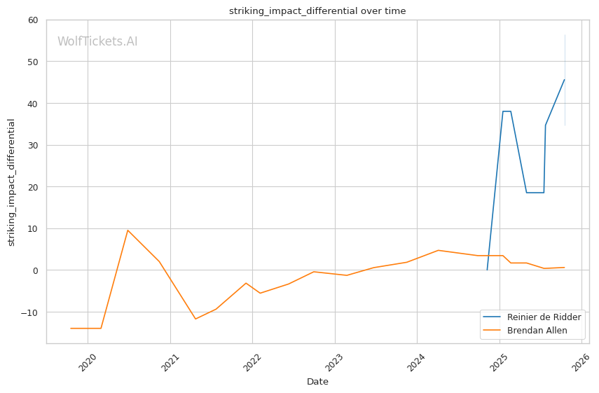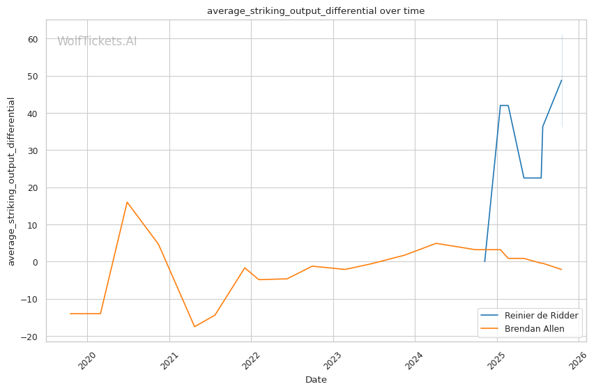 Average Striking Output Differential decreased the score by 2 points, acknowledging Allen's historical volume advantage. But this metric doesn't account for de Ridder's systematic body work that compromises opponents' output over time.