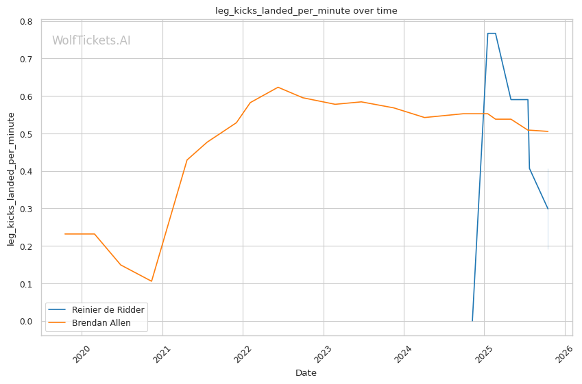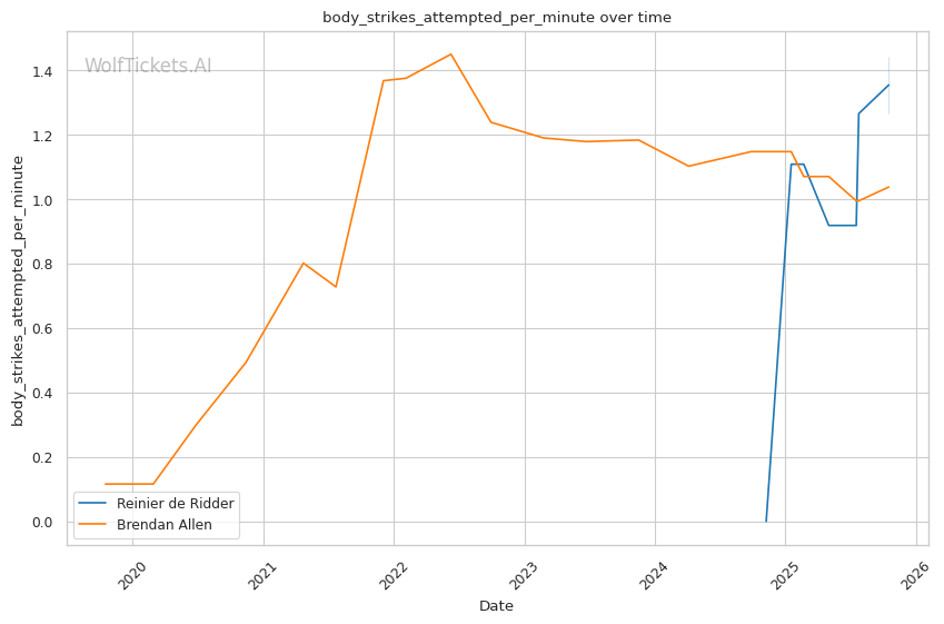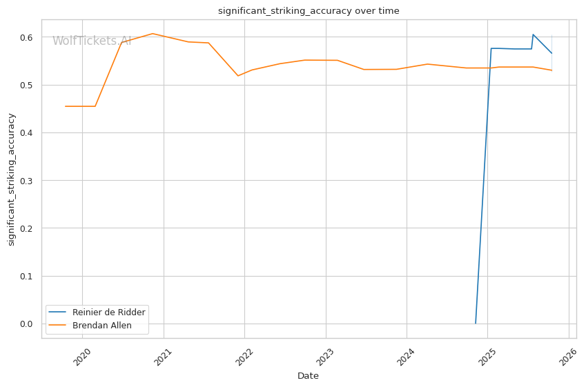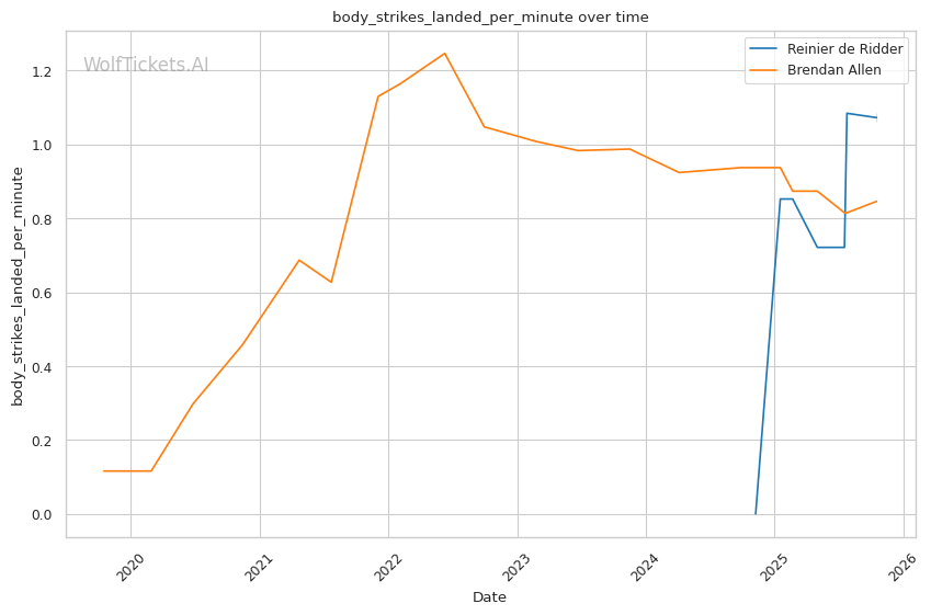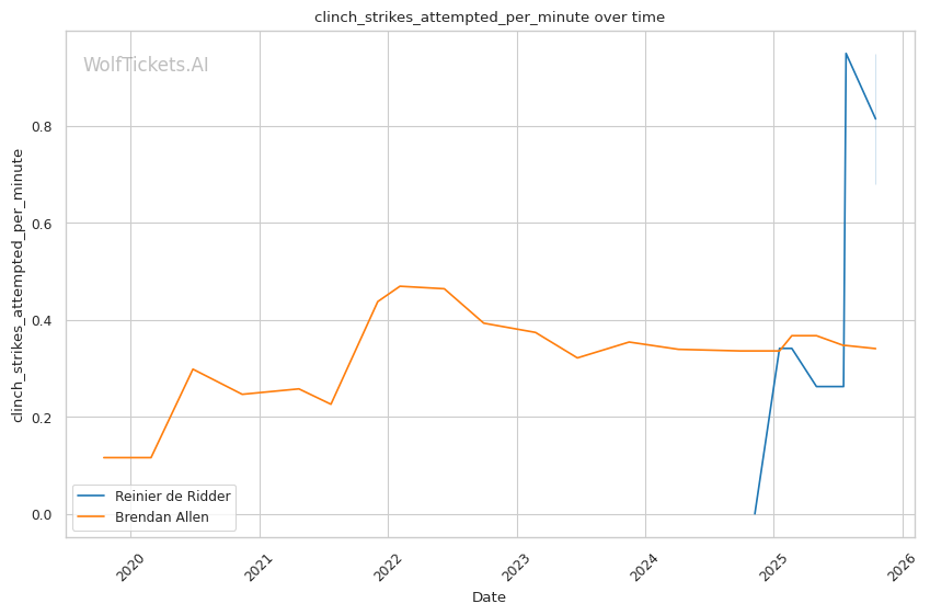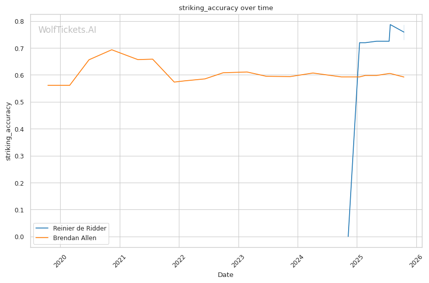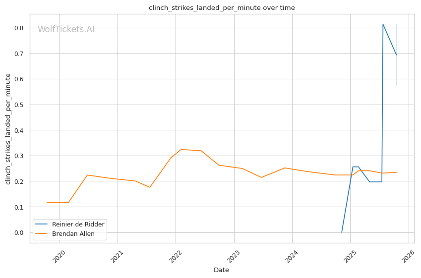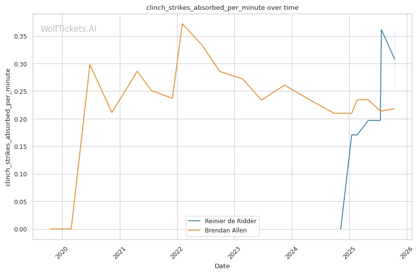 Striking Defense Concerns: Allen's 38% recent striking defense and 43% significant striking defense are alarming against de Ridder's systematic body attack. Allen absorbs 2.75 head strikes and 0.53 body strikes per minute recently—de Ridder's body work will find its target.