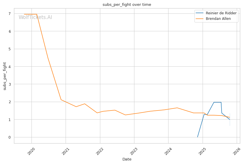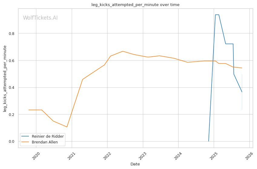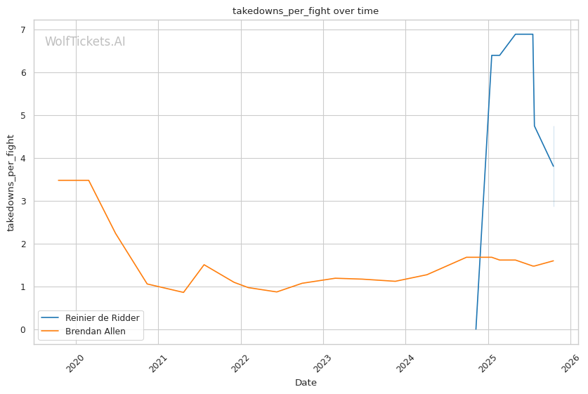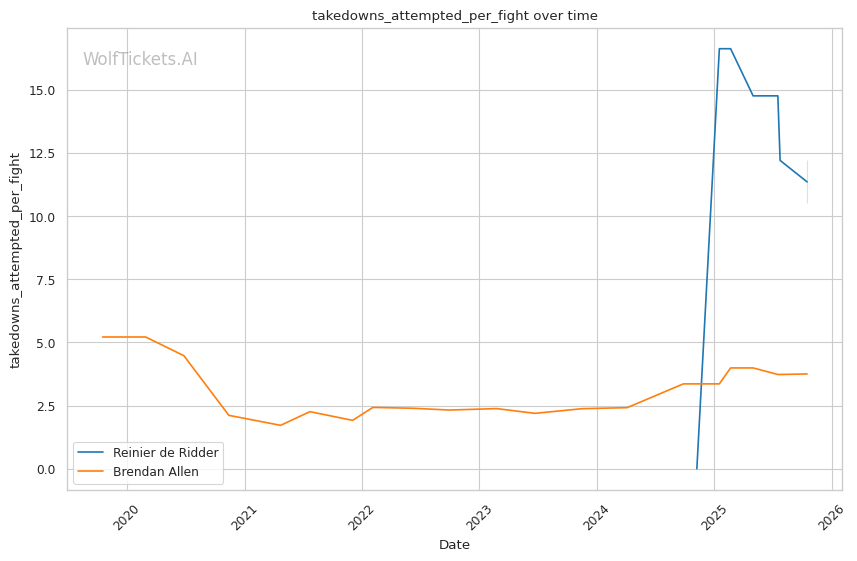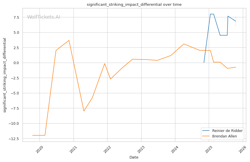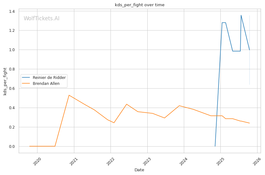 Takedown Volume: De Ridder's recent 13.7 takedowns attempted per fight (increased prediction score by 2) versus Allen's 3.5 attempts suggests de Ridder will be the aggressor in grappling exchanges. His 41% recent accuracy is serviceable, and his improved clinch entries make these attempts more dangerous.
