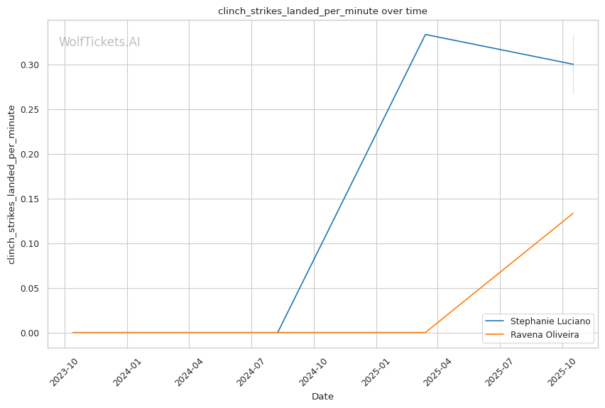 Clinch Trap: Oliveira "was never able to escape the clinch" in Round 2 against Lisboa and "landed some good punches but went right into the clinch" in Round 3. She absorbs 0.73 clinch strikes per minute—highest of any metric—while landing just 0.13. She gets trapped against the cage, can't create separation, and bleeds position. Luciano's Muay Thai clinch work and knees to the body will exploit this relentlessly.