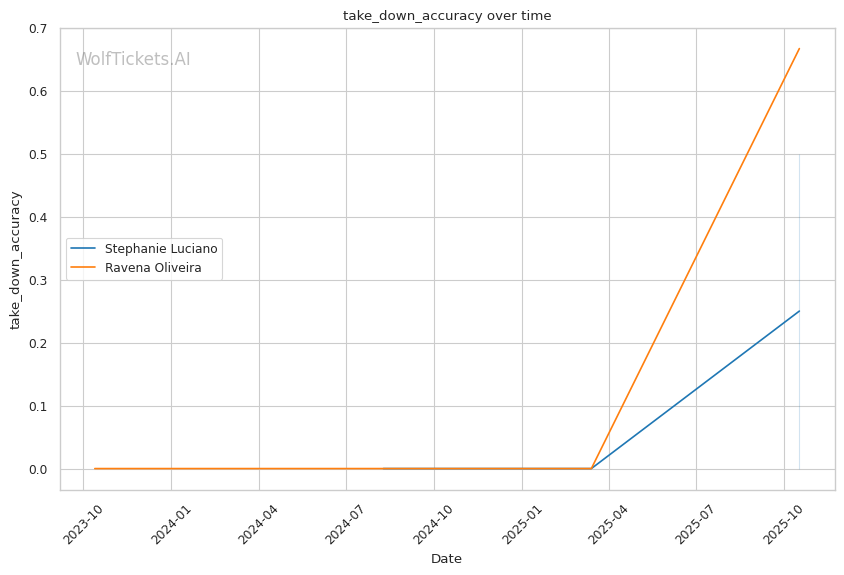 Mid-Fight Adjustments: Oliveira recognizes she's losing on the feet and commits to wrestling. She attempts 3.00 takedowns per fight at 66% accuracy, so she'll likely land at least one. But her inability to maintain top control means Luciano scrambles back up quickly. If Oliveira does achieve sustained top time, Luciano's bottom position struggles emerge—but Oliveira's own positional incompetence (losing mount to Lisboa, getting reversed from top) suggests she can't capitalize. This phase becomes a scramble-heavy grind where Luciano's superior conditioning (maintaining output in Round 3 against Hughes despite 21% accuracy) gives her the edge.