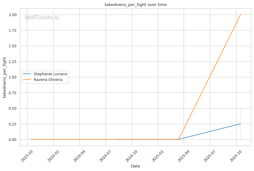 Wrestling Neutralizes: Oliveira's 2.00 takedowns per fight at 66% accuracy vs Luciano's 28% recent TDD suggests Oliveira lands takedowns. But Oliveira's ground control incompetence (getting reversed by Lisboa, losing mount) means she can't capitalize. Luciano's scrambling ability (exploding up against Hughes repeatedly) keeps the fight standing where she dominates.