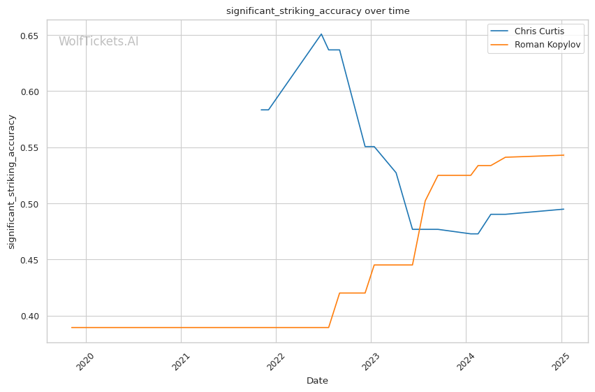 The model has correctly predicted two of Kopylov's last three fights, including his win over Josh Fremd and loss to Anthony Hernandez. However, its track record with Curtis has been less reliable, incorrectly predicting four of his last six outcomes. This inconsistency in predicting Curtis's fights adds some uncertainty to the current prediction.
