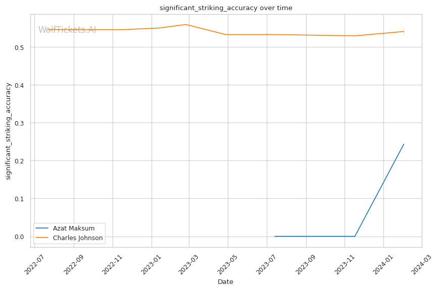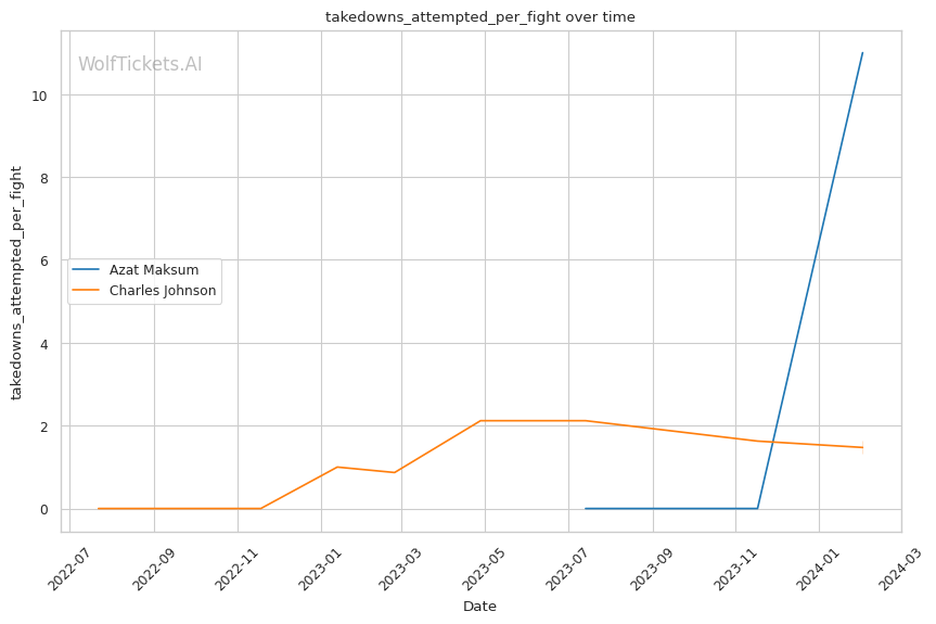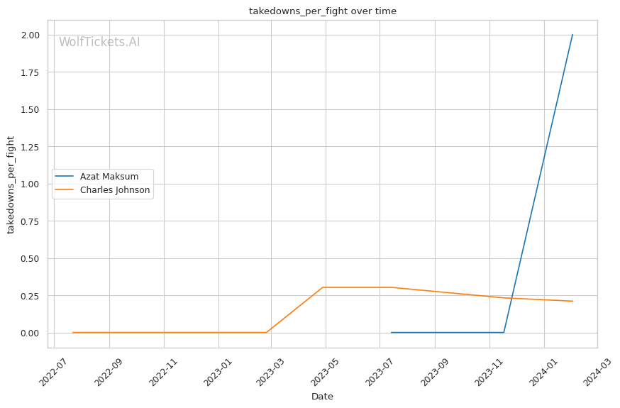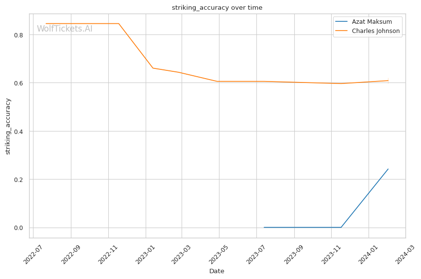 Considering both fighters' strengths and weaknesses, Azat Maksum's precision striking and ability to control the fight's pace give him an edge over Charles Johnson. Maksum's methodical approach, combined with his solid takedown defense, positions him well against Johnson, who, while resilient, has shown vulnerabilities in his striking game and against persistent pressure. WolfTicketsAI's prediction of Azat Maksum winning is based on his undefeated record, striking accuracy, and his ability to dictate the fight's flow, capitalizing on Johnson's recent struggles in the octagon.
