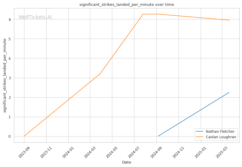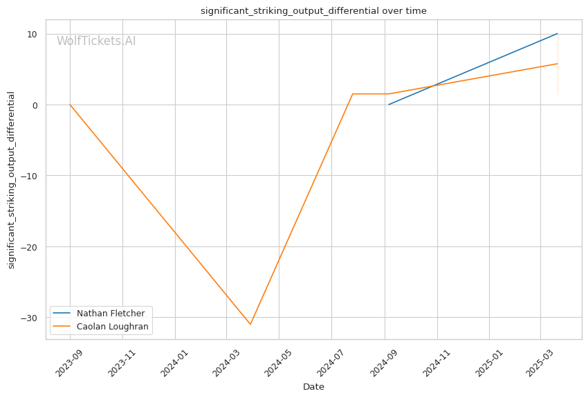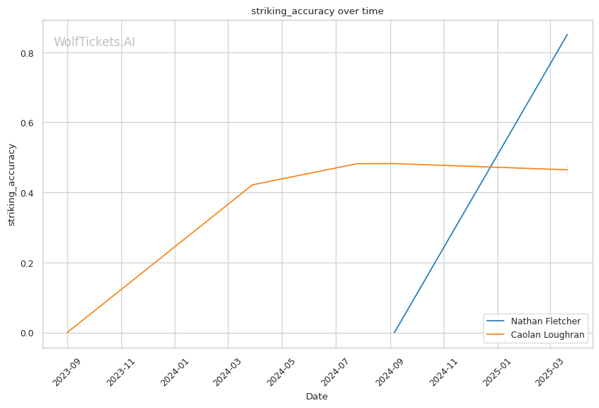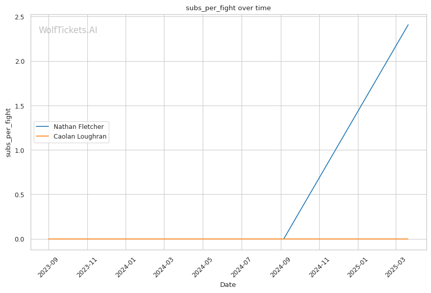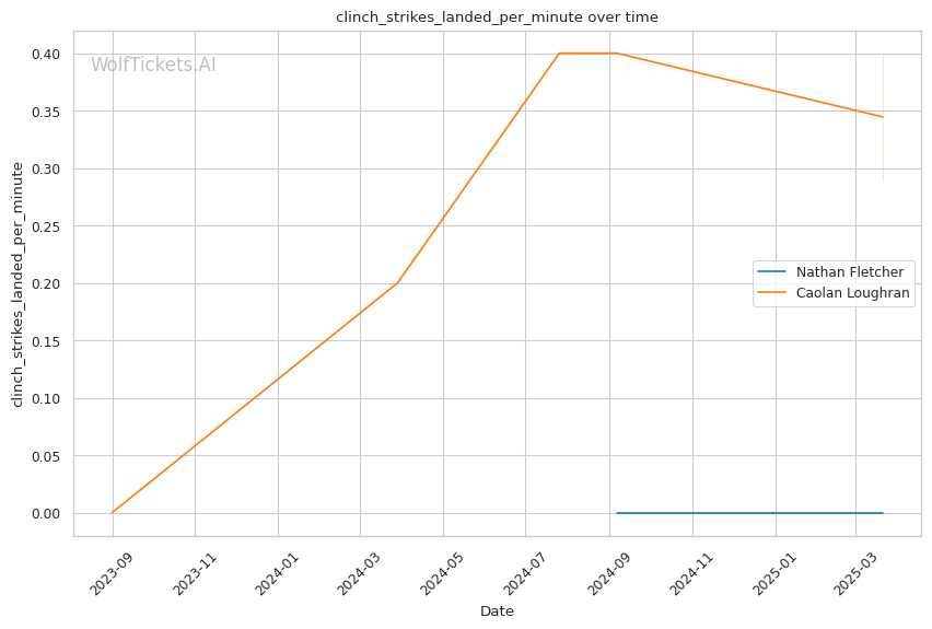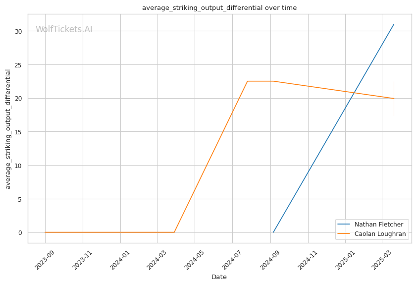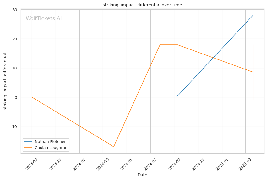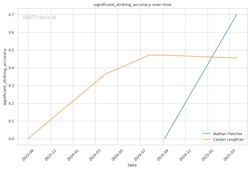 While Loughran shows decent takedown attempts (7.66 per fight), his 26% accuracy is concerning against a grappler of Fletcher's caliber. Loughran's striking volume is comparable to Fletcher's (6.35 strikes per minute), but his accuracy is significantly lower at 44.7%, making him less efficient in exchanges.