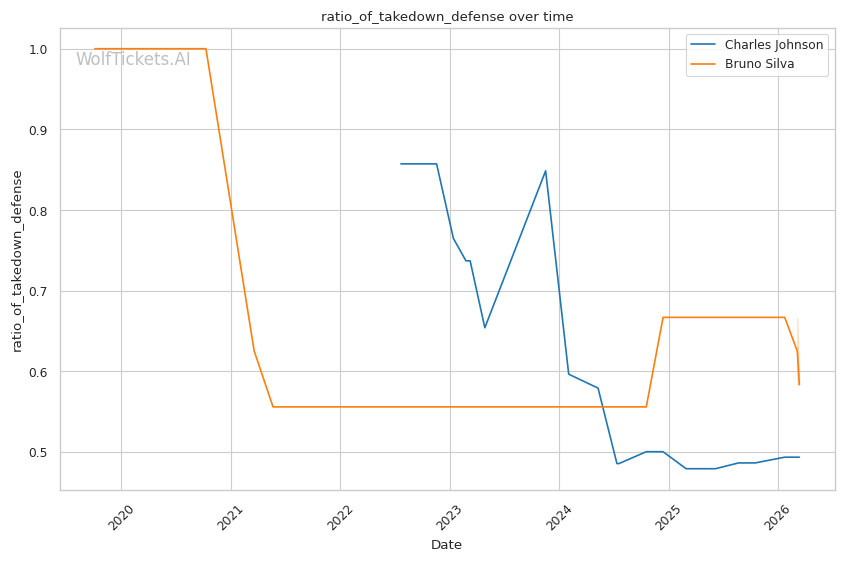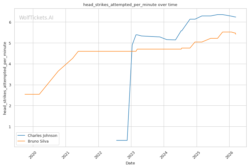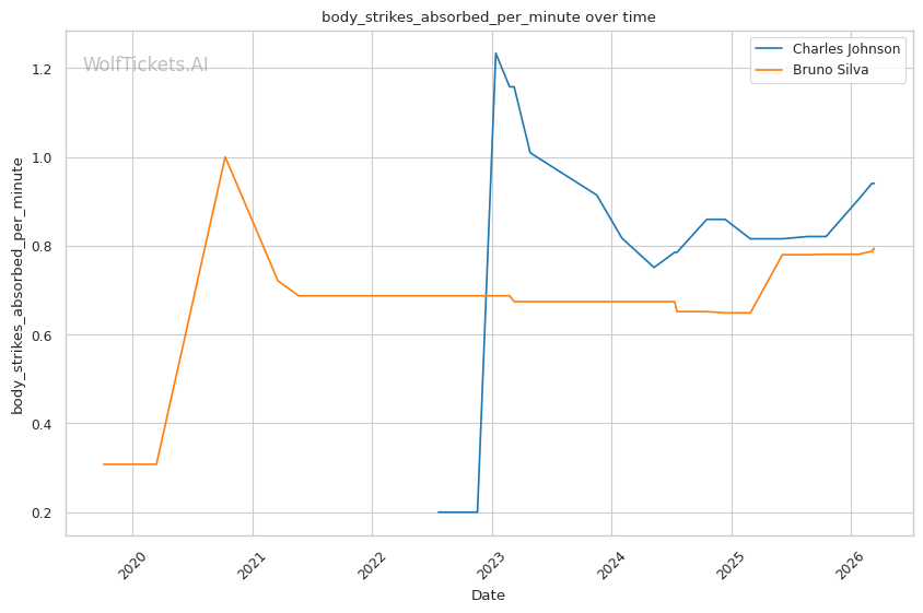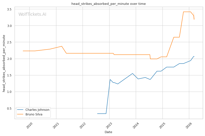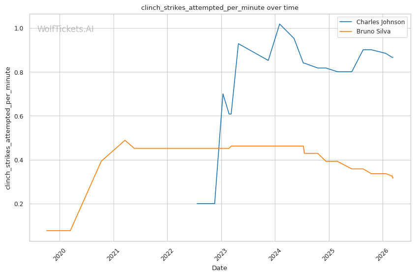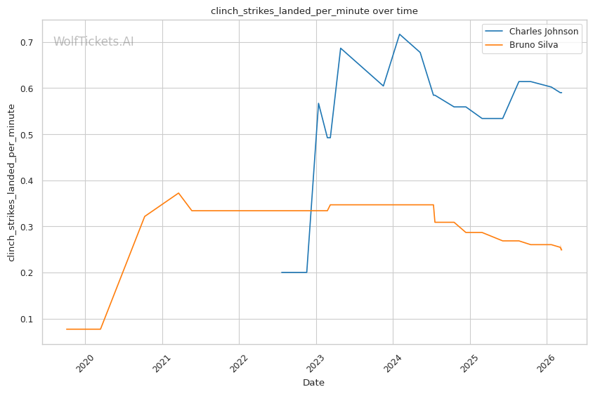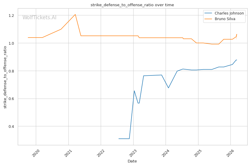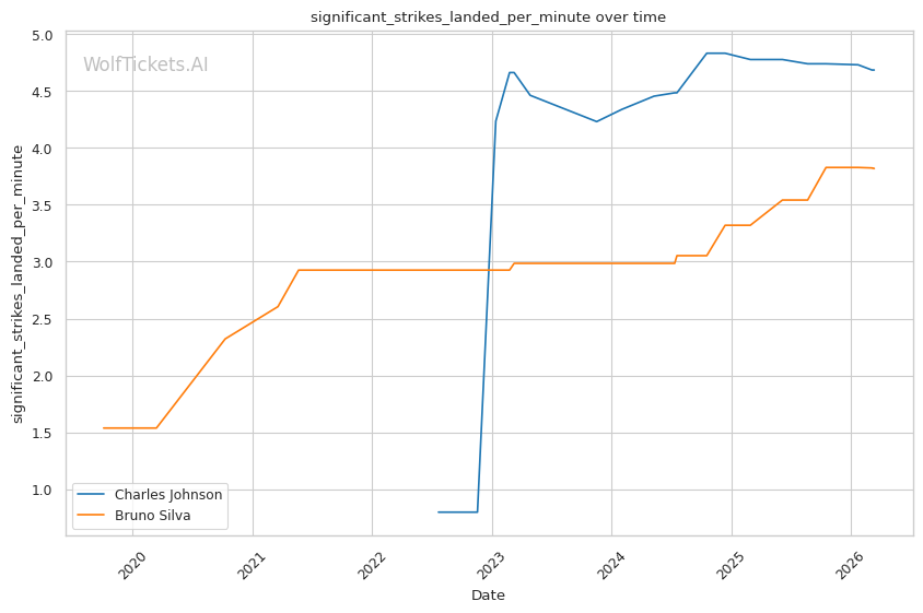 Johnson's volume advantage is significant. He lands 4.68 significant strikes per minute compared to Silva's 3.82. Over three rounds, this output differential compounds.